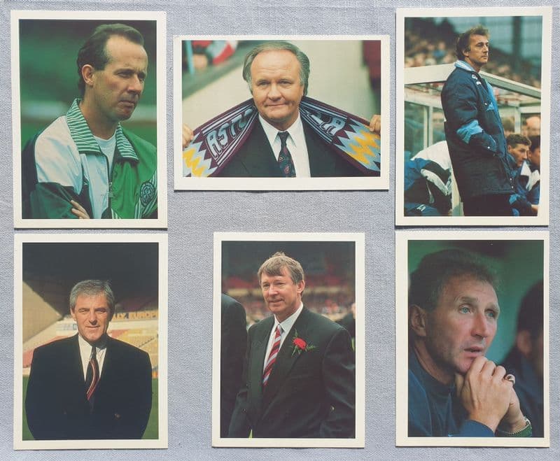 Six postcard sized cards produced by Bassett sweets in 1992 - in conjunction with Match Magazine; in very good condition; managers are Liam Brady, Ron Atkinson, Trevor Francis, Howard Wilkinson, Alex Ferguson and Walter Smith