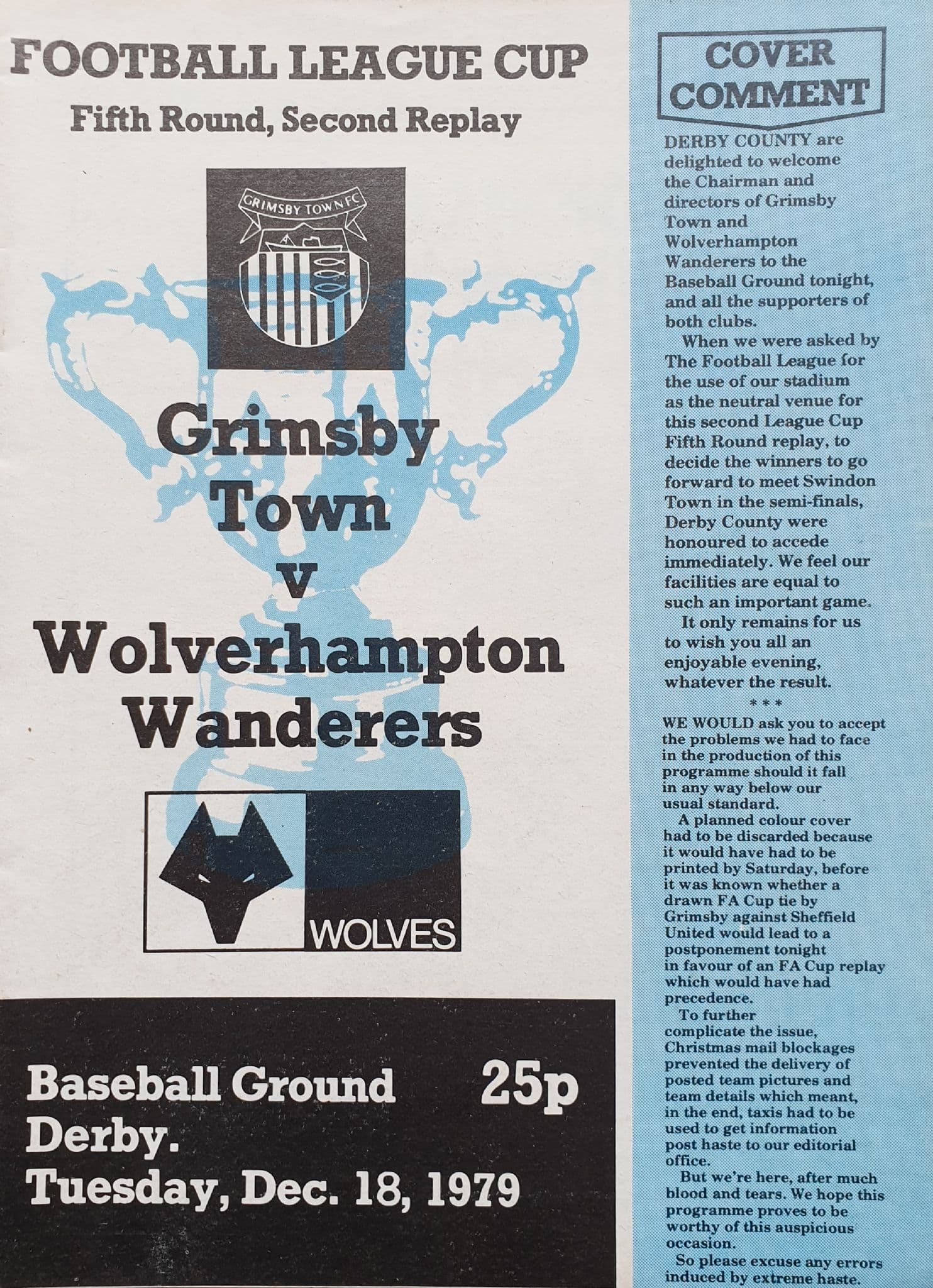 Programme from the League Cup 5th round second replay, between Grimsby Town and Wolverhampton Wanderers at the neutral Baseball Ground - played on Tuesday 18th December, 1979; in good condition, with some slight staple rusting; 16 pages