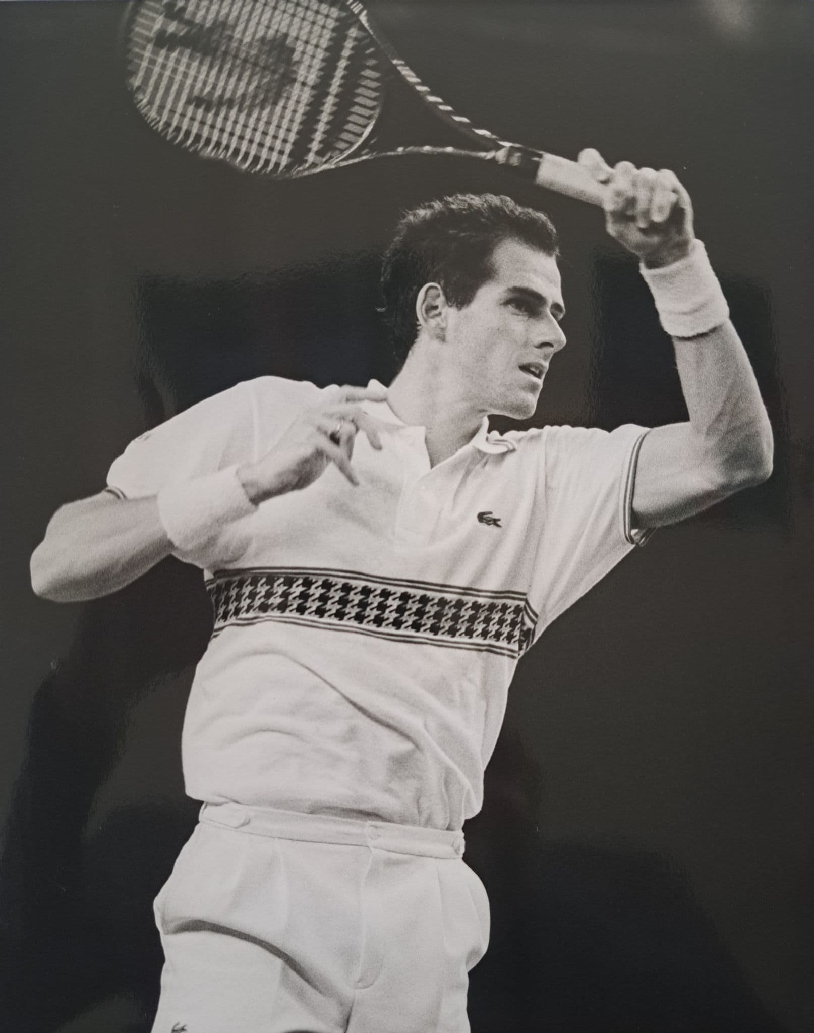 Black and white press photo showing Guy Forget hitting a forehand, with Lacoste racket and kit in perfect harmony; 19.5cm by 24.5cm; portrait; photograph by Bob Thomas