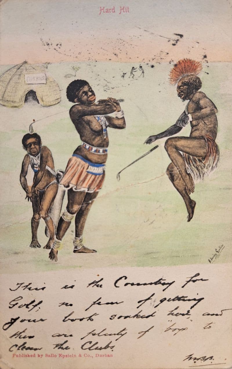 Used post card, showing a cartoon drawing of a "South African golf course" from the early 1900s; message to front and back; in fairly good condition, with a slight diagonal crease; Transvaal stamp and Johannesburg postmark; dated 27.11.05; c.9cm by 14cm