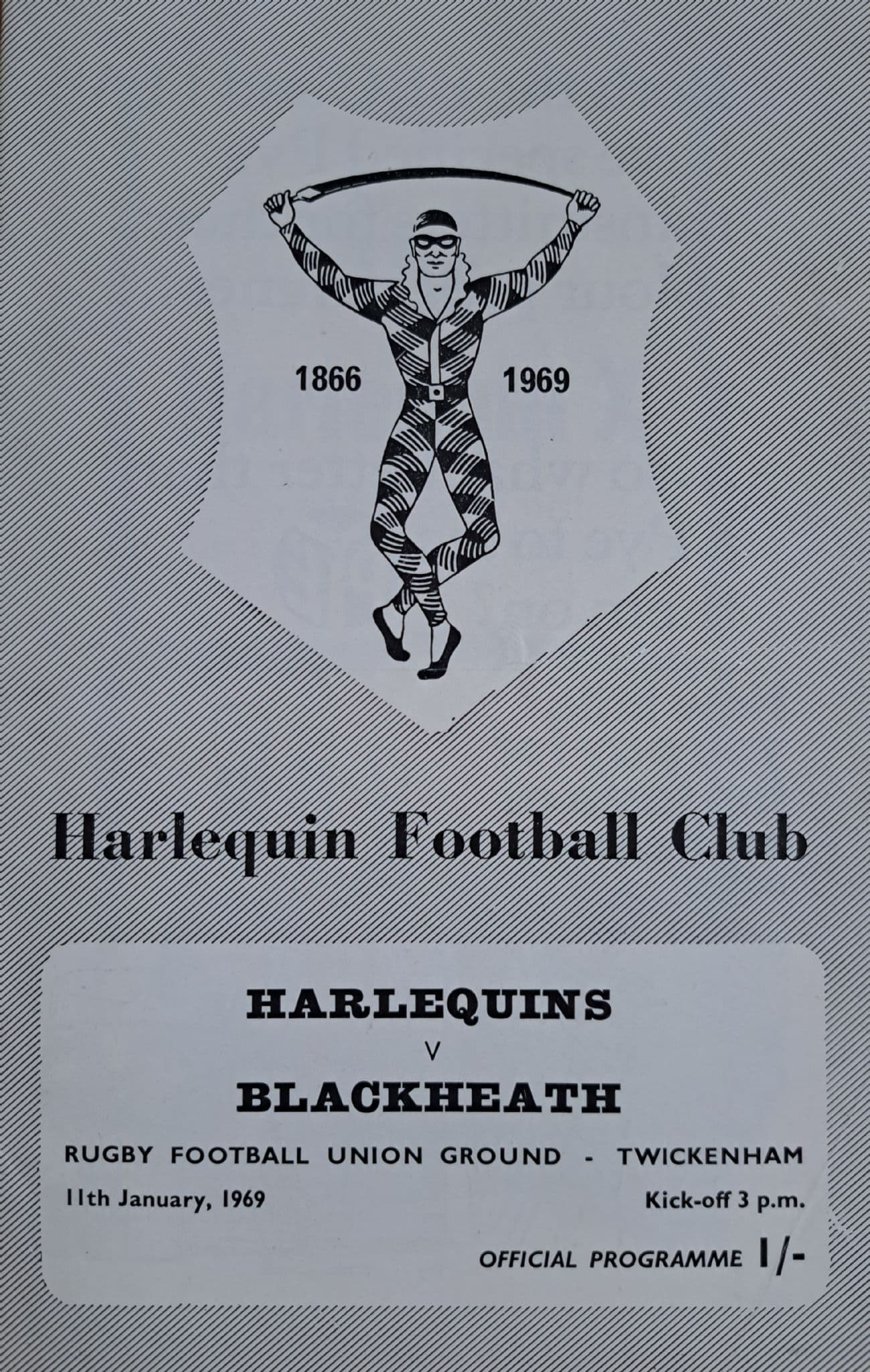 Programme from the game between Harlequins and Blackheath at Twickenham; played on 11th January, 1969; in good condition, with a very slight horizontal pocket fold and scores / team change marked on the centre page