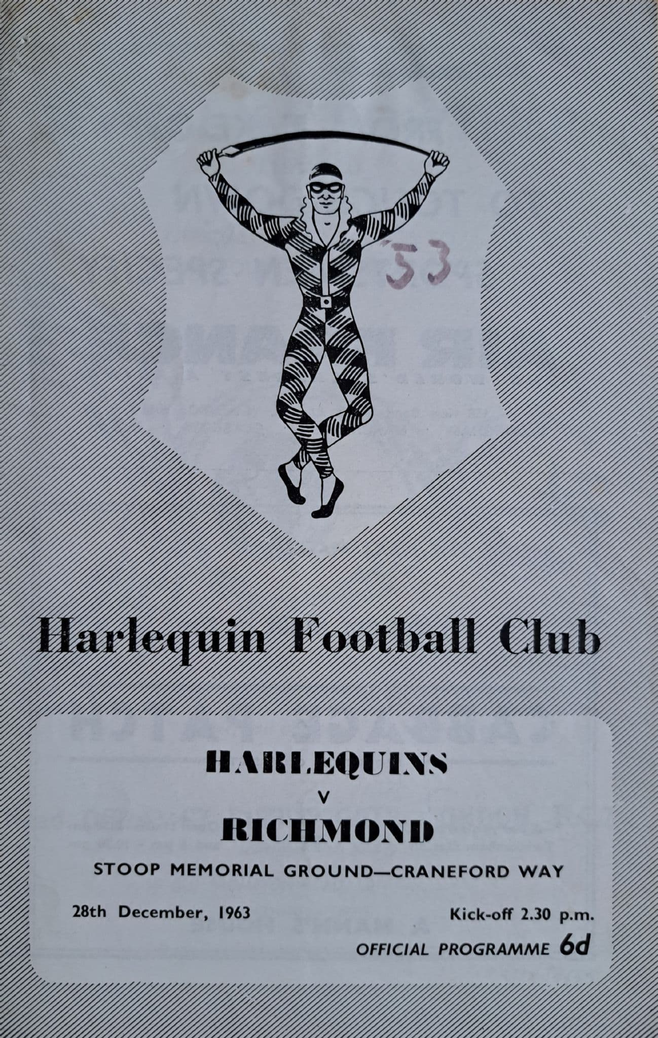 Programme from the game between Harlequins and Richmond at The Stoop; played on 28th December, 1963; in fairly good condition, with slight pocket wear and pin holes / "53" on the front cover
