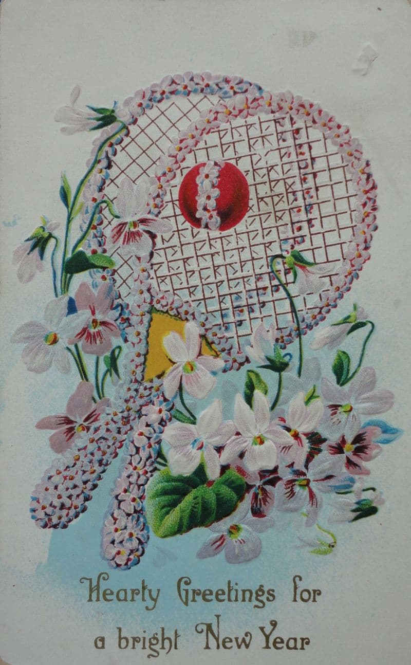 Postally-used card, which appears to link tennis, flowers and the new year; some neat copper-plate writing to the reverse of the card; 9cm by 14cm; in good condition; picture has been slightly embossed in places, but also has some "reverse-embossing" due to the franking; postmark suggests production around 1908
