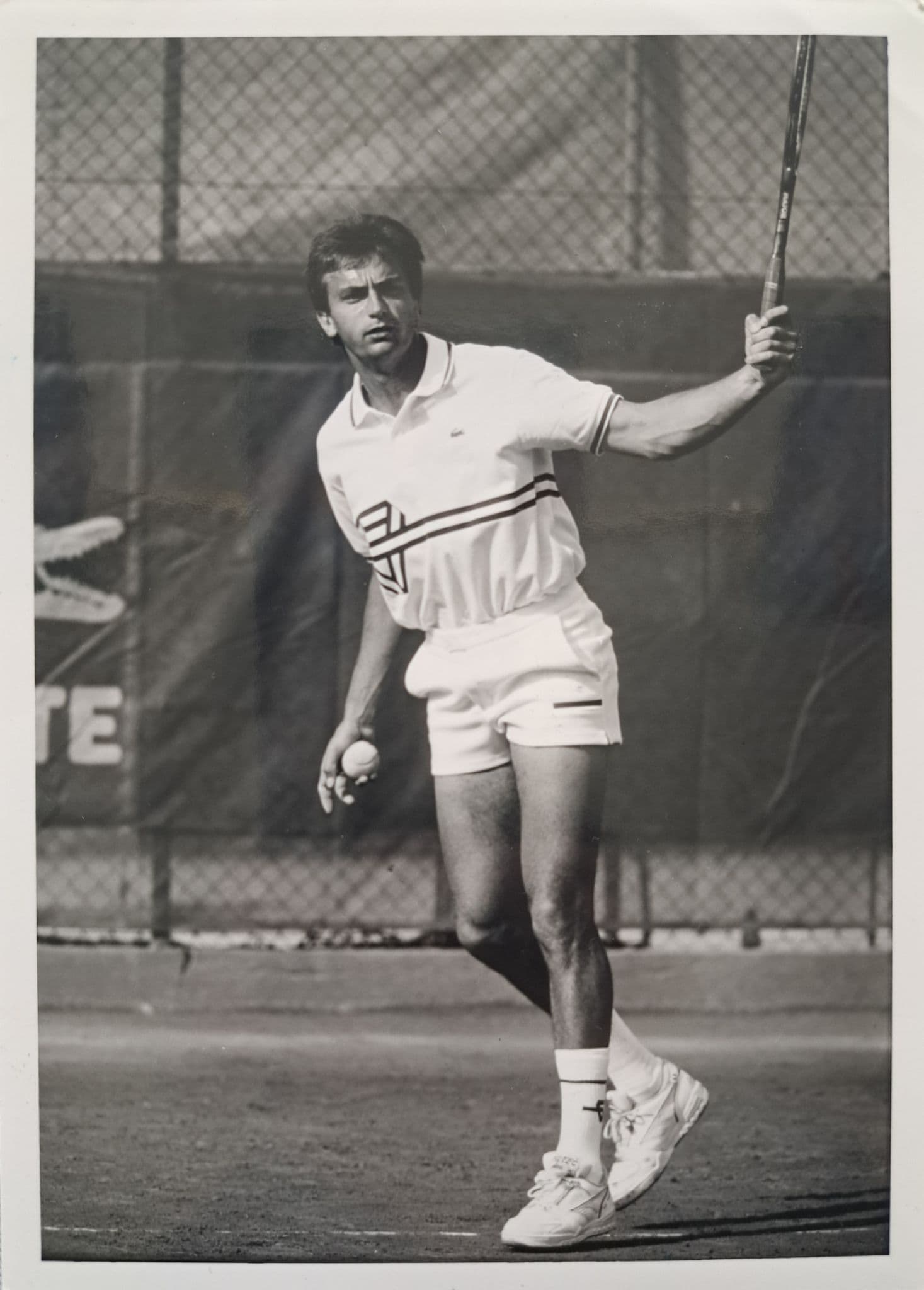 Black and white press photo, which seems to relate to a Lacoste 1991-92 press release; 11.5cm by 16.5cm; portrait; picture shows Henri Leconte hitting a backhand on a clay court