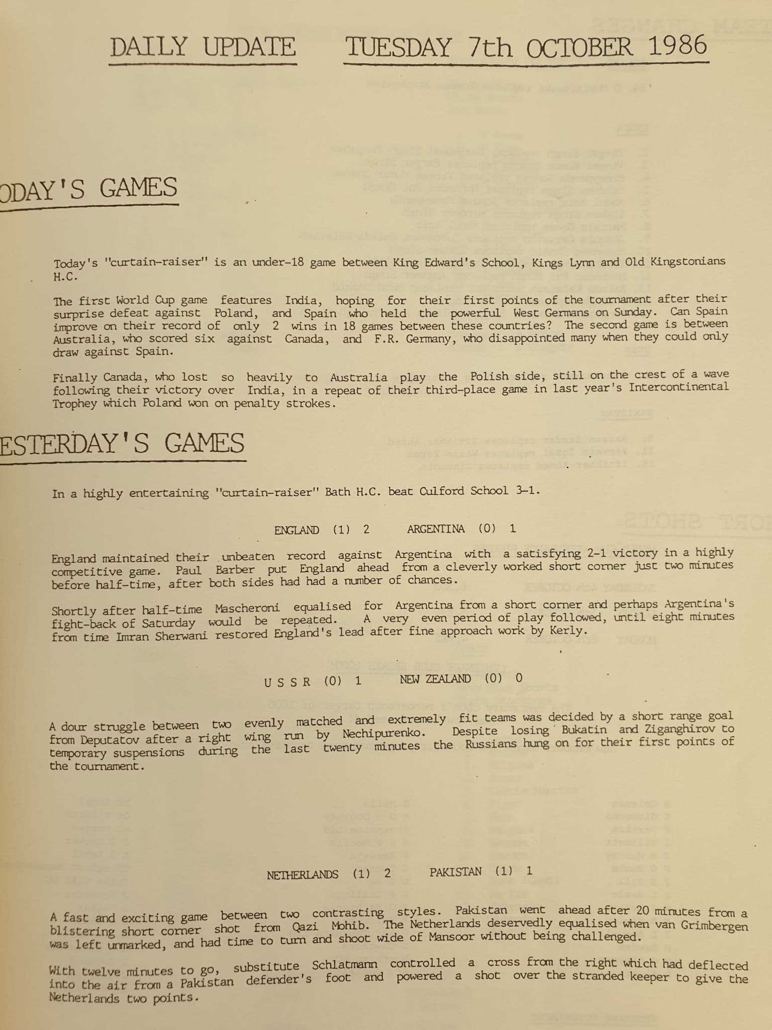 Daily programme update for the 6th FIH World Hockey Cup for Men; held at the National Hockey Centre (London), from October 4th-19th, 1986; in fairly good condition, with very slight vertical creasing; A4 size; 8 page update for Tuesday October 7th