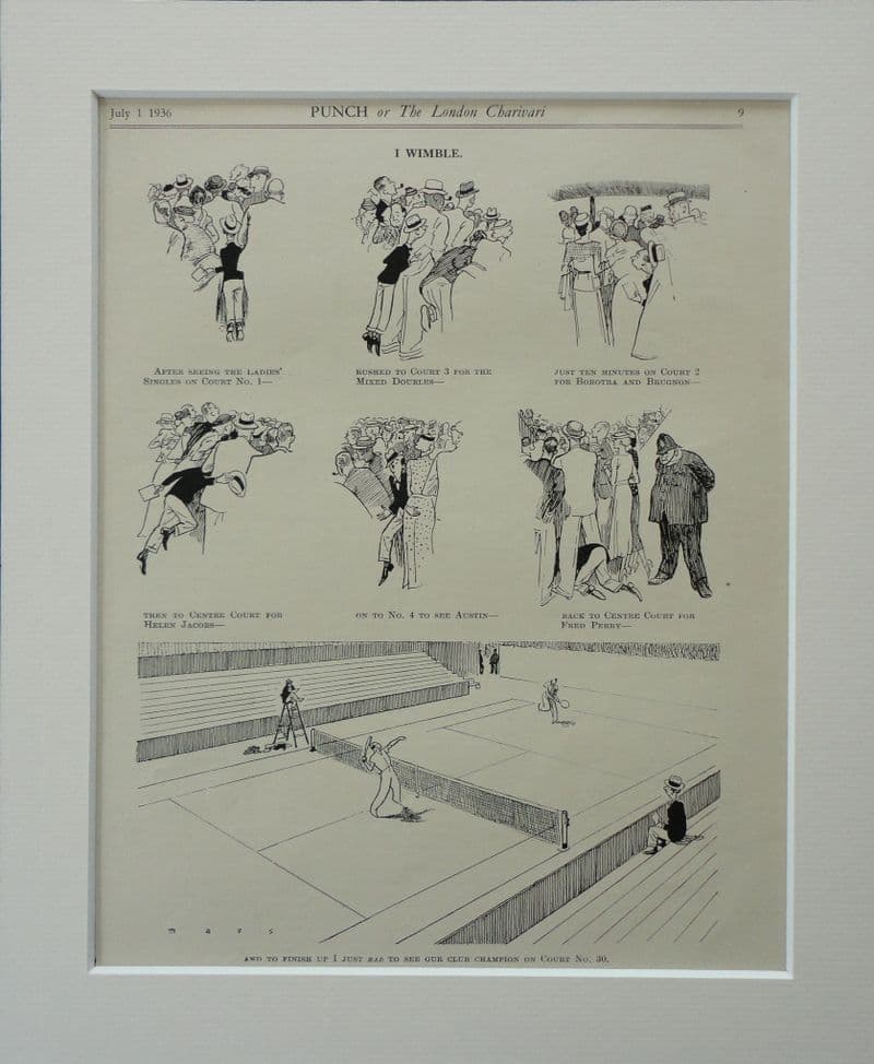 Punch tennis cartoon from July 1st, 1936; full page approximately 16cm x 24cm; drawn by Douglas Lionel (DL) Mays - would make an ideal addition to the wall of any drawing or billiard room; comes with backing and mount ready to be framed
