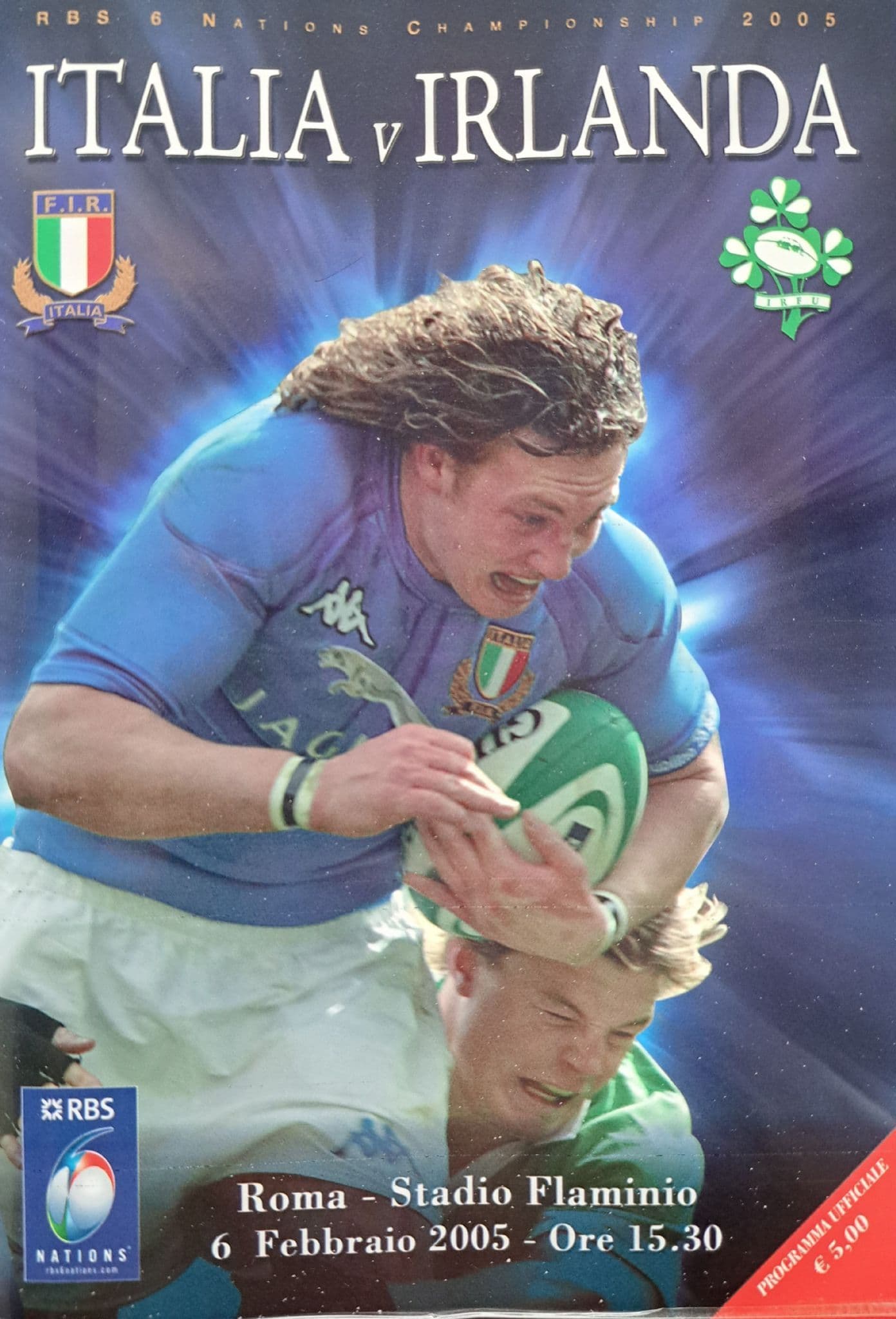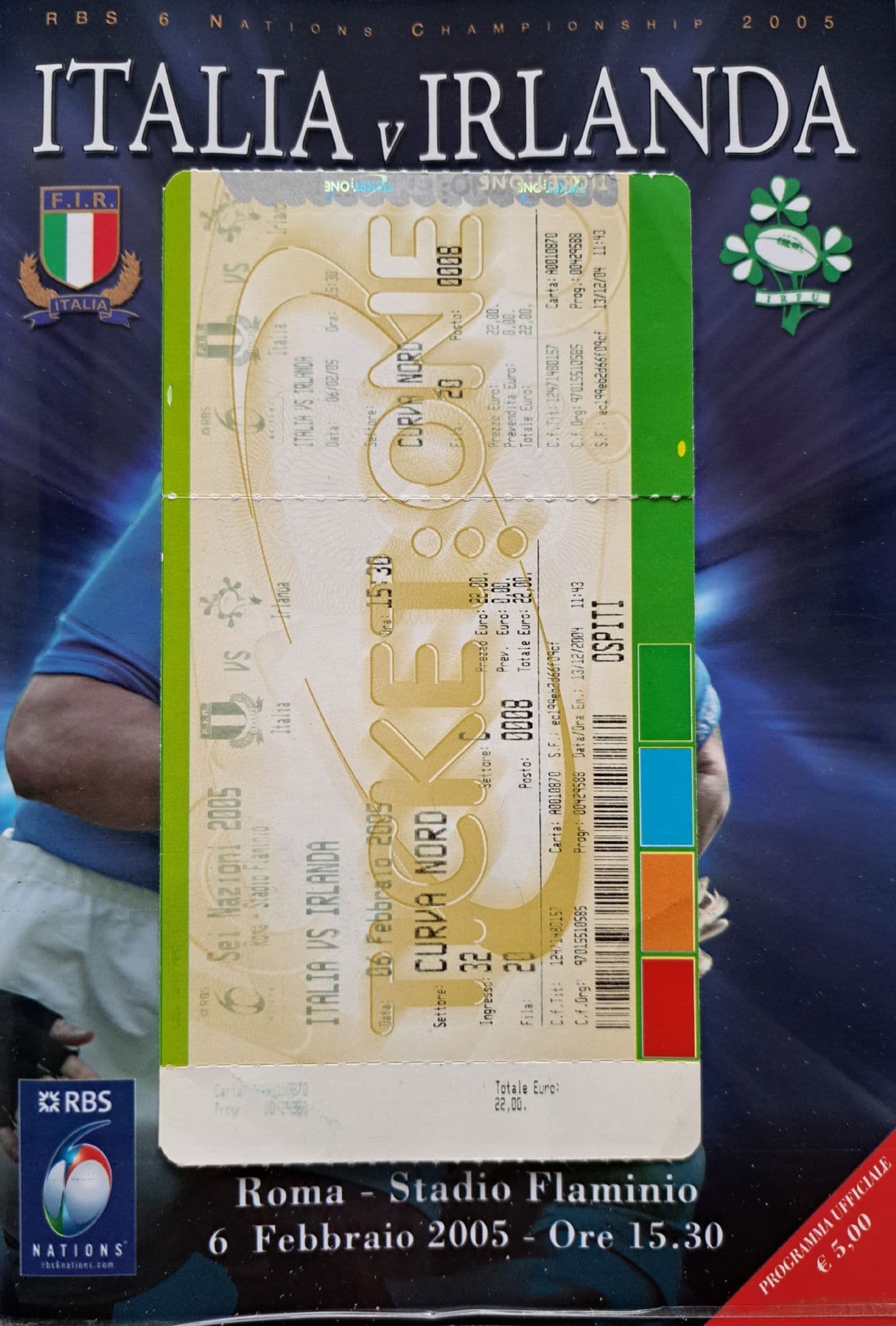 Programme from the 6 Nations match, between Italy and Ireland; match played at the Stadio Flaminio in Rome, on February 6th, 2005; mainly Italian language; 64 pages; in good condition, apart from a slight peel at the bottom of the cover; includes match ticket