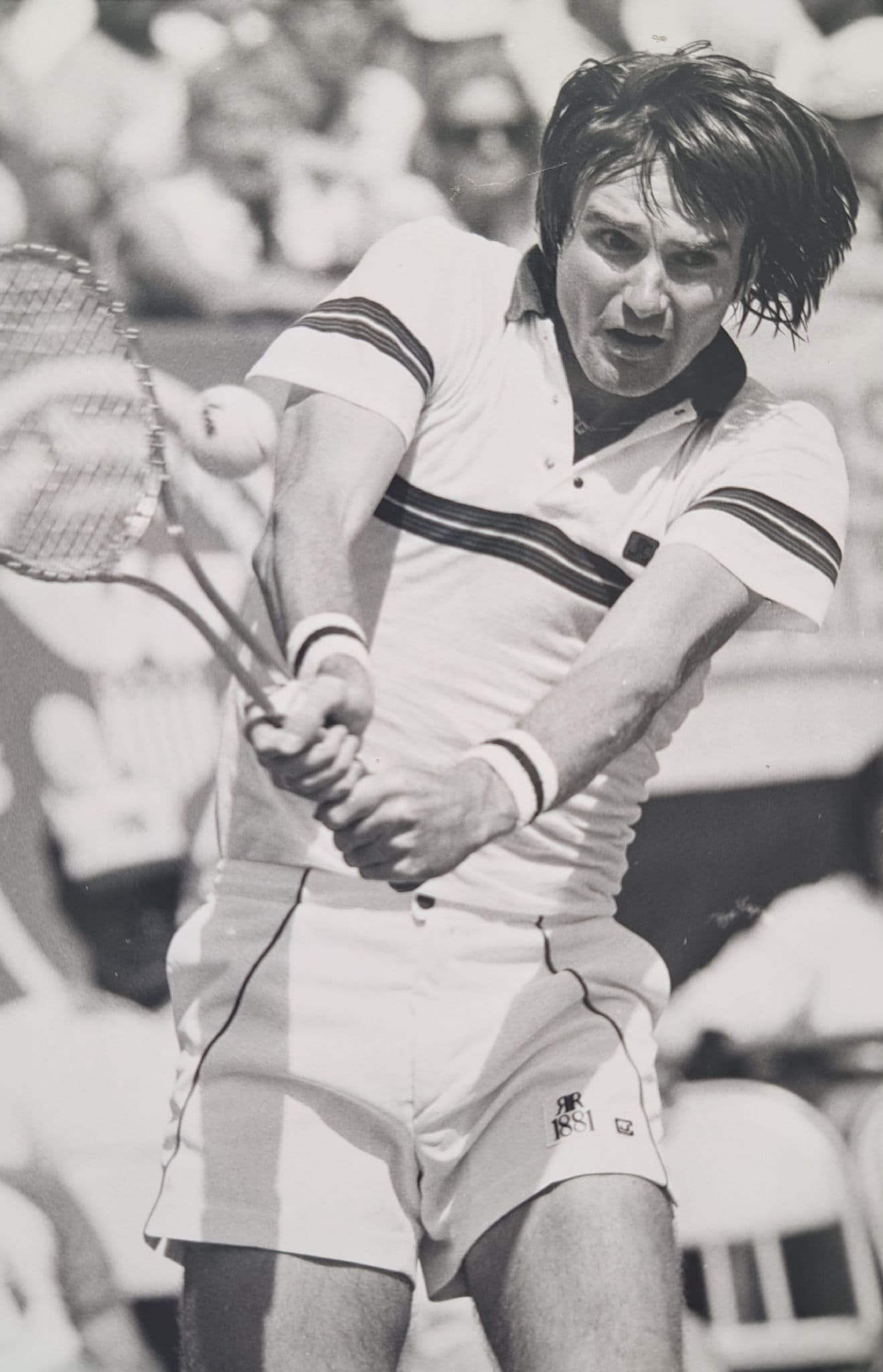 Post-card sized photo of Jimmy Connors hitting his trademark backhand at some point in the 1970s; portrait; in good condition; 9cm by 13.5cm; from a recently acquired Tommy Hindley collection, though has no press stamp / info to rear