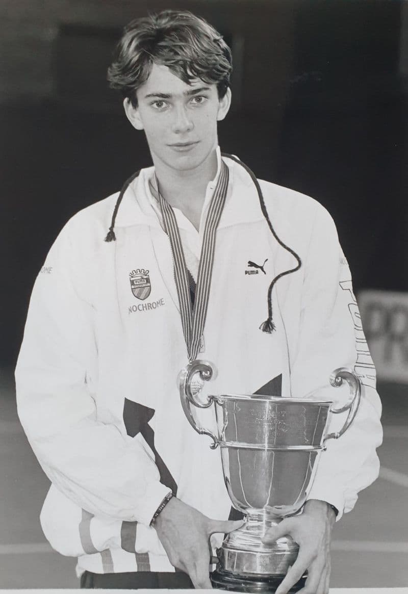 Press photo of Jonathan Haycock, with the trophy for the British Junior Covered Court event of 1989; 16.5cm by 23.5cm; portrait; photograph by Jim Steele, for Professional Sport