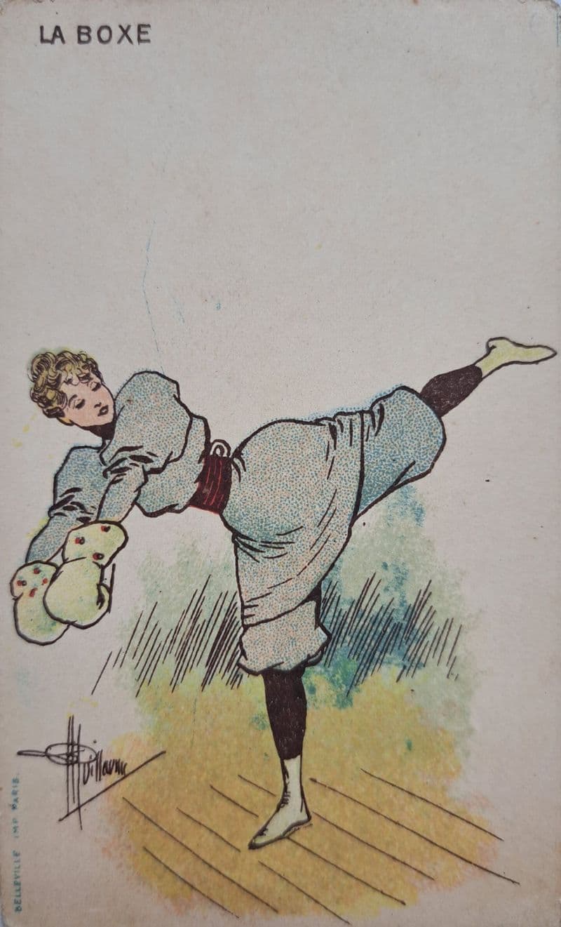 Coloured card, with a female boxer on the front; card by Belleville of Paris - and produced for the Grondard chocolate / tea shops in Paris; in good condition; c.11cm by 7cm