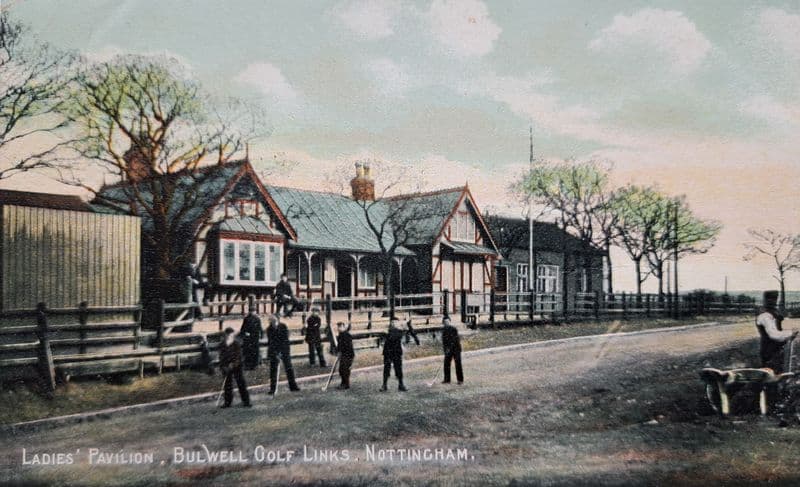 Used post card, showing the Ladies Pavilion, at the Bulwell Golf Links in Nottingham; coloured; message to rear; in good condition; postmark dated 1906; c.9cm by 14cm; part of the Clumber Series No 157