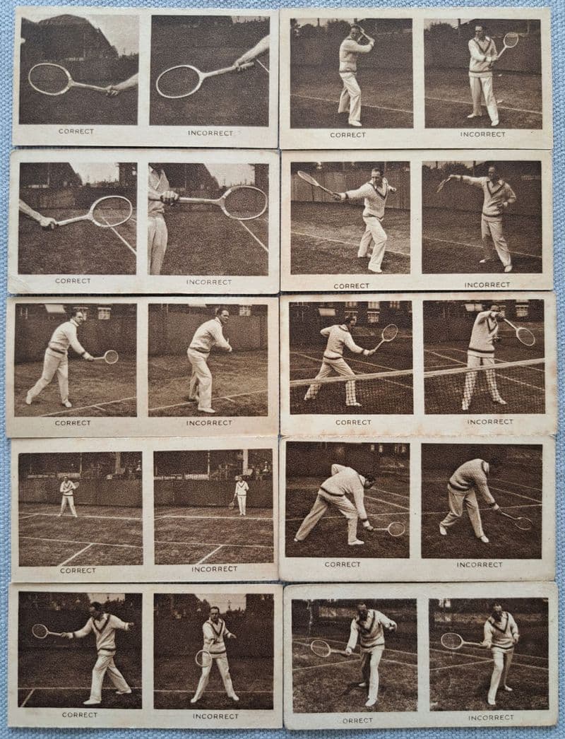 10 of 25 cards issued with Godfrey Phillips Cigarettes in 1930; in good condition; each of the cards shows a different stroke being played in a correct and incorrect manner; buildings in the background suggest that all the pictures were taken on the grass courts at the Queen's Club in West London; cards are 1, 2, 7, 8, 10, 12, 13, 19, 24, 25