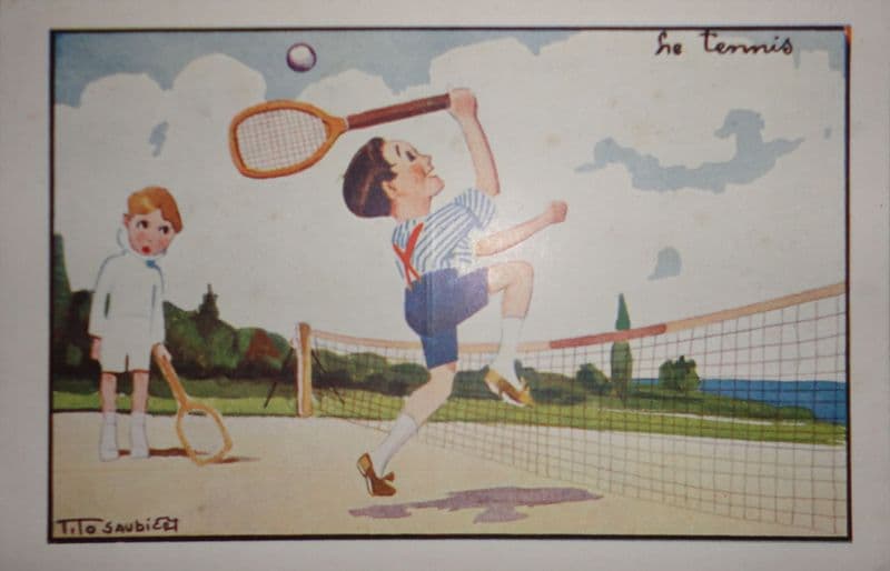 Postally unused coloured card (which was used as a birthday greeting card, with some neat writing to the reverse), the artist is Tito Saubidet, and the card appeared to have been sold by the "Grand Magasins de Printemps of Paris; approximately 9cm by 14cm; in very good condition