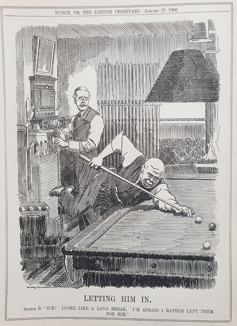 Billiards / politics cartoon which appears to be by Edward Linley Sambourne; full page, approximately 18cm by 25cm; dates to January 17th, 1906. Would look excellent framed ..... The Racketeer knows as he already has a number of these in the study!