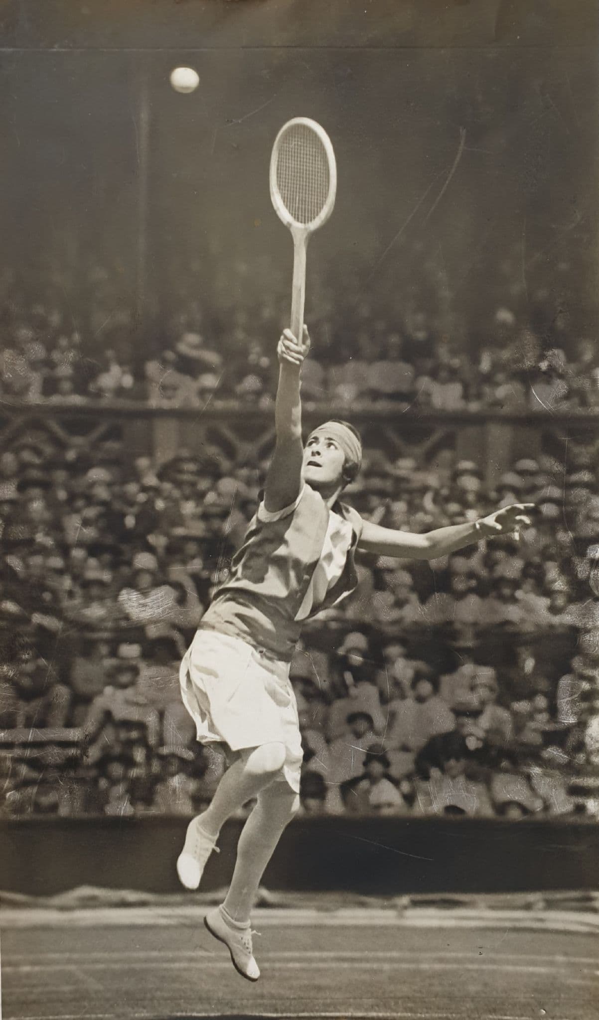 Black and white press photo showing Lili Alvarez playing at Wimbledon - the rear of the photo states the date to be 1928, a year in which she reached the final; portrait; 24cm x 14cm; in fairly good condition, with some slight wear / creasing to the border - small piece of the top left-hand border corner is missing; information / press stamp to the rear