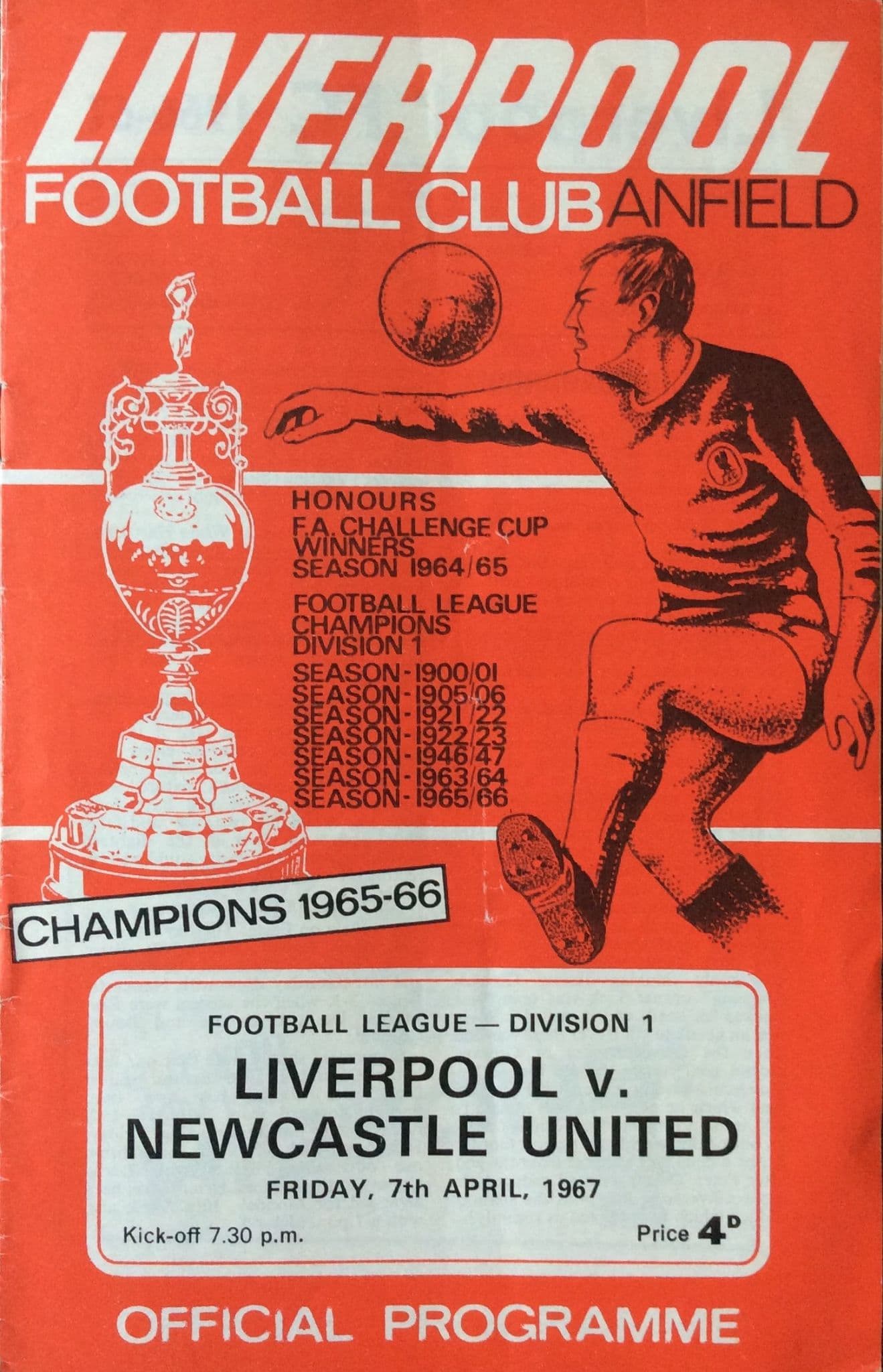 Programme from the Liverpool v Newcastle United match, played at on Friday 7th April , 1967; programme is in fairly good condition, with no writing or external marks, but a slight pocket fold; both teams include some famous names from yesteryear including Yeats, Hunt, Callaghan, Moncur and Robson (Bryan and not Bobby!)