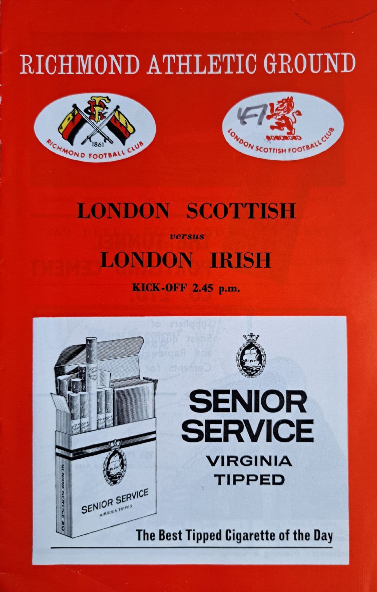 Programme from the game between London Scottish and London Irish - played on 30th October, 1965; 16 pages. In good condition, with a slight pen mark to the top of the front cover but no writing elsewhere