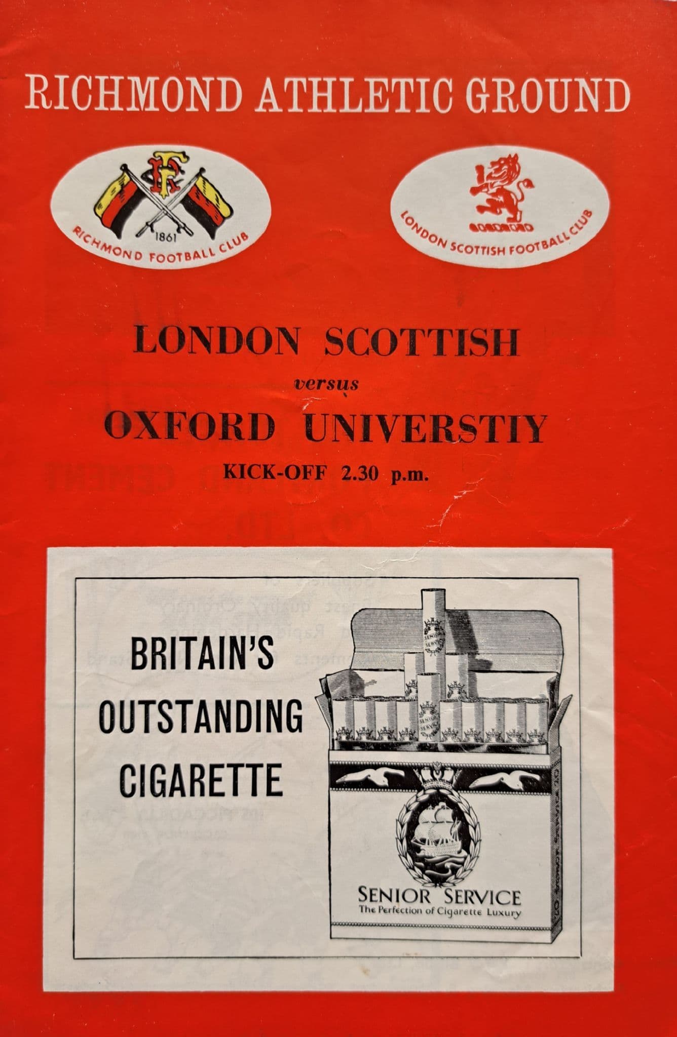 Programme from the game between London Scottish and Oxford University - played on 28th November, 1964; 16 pages. In fairly good condition with slight signs of pocket wear and teams changes / scorers marked on the centre pages - which suggests a convincing win for the home side