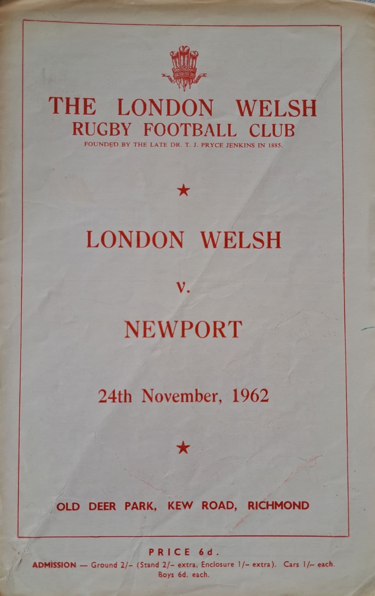 Programme from the game between London Welsh and Cardiff, held at Old Deer Park on Saturday 24th November, 1962; programme in fairly good condition, with diagonal fold / wear to the edges - but no writing