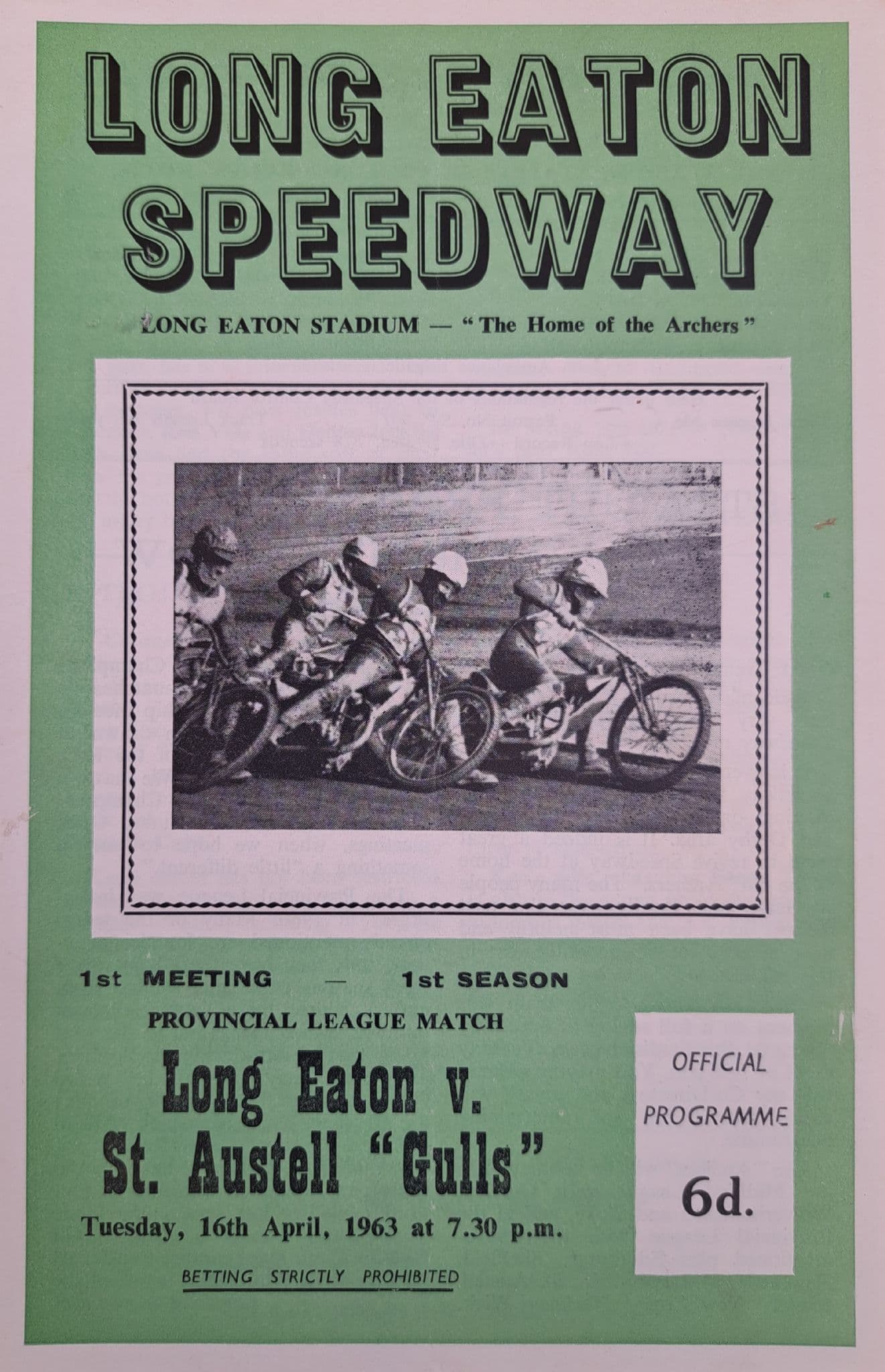 Programme for meeting 1 in the first season of speedway at Long Eaton - and a match v St Austell; 8 pages; in fairly good condition, with a slight pocket fold, but no writing