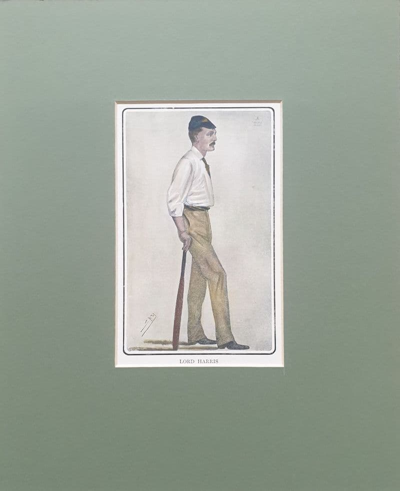Hand-coloured SPY picture (possibly from a book or magazine), which shows Lord Harris leaning nonchalantly on his bat; comes with green backing and mount ready for framing; border is about 23cm by 28cm, with the image 15cm by 9.5cm