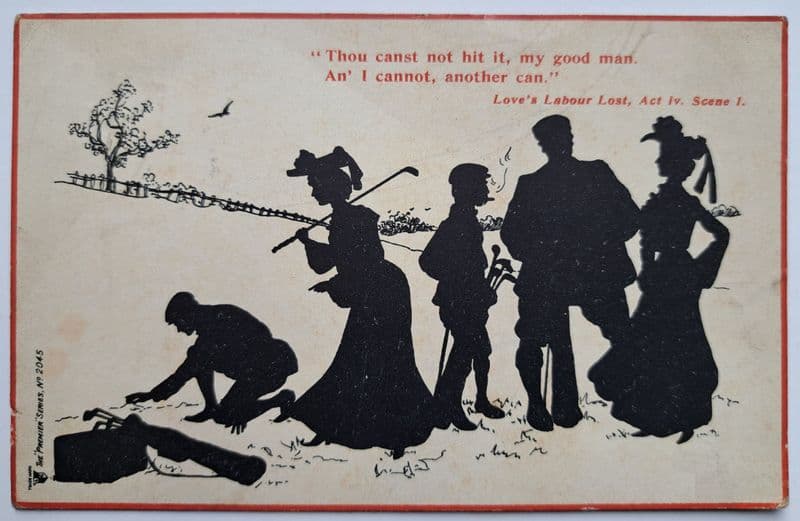 Used post card, showing a silhouette cartoon drawing - linked to some Shakespeare verse; message to rear; in good condition; postmark dated 1904; c.9cm by 14cm; part of the "Premier" Series - No.2045