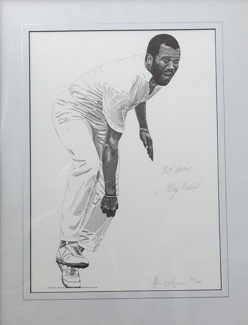 Black and white print by David J Byrne; print is signed by the artist and Malcolm Marshall - both with a pencil signature; 90 of 500; image is approximately 39cm by 27cm, with white mount around that - and a thin, black frame (c.53cm by 42cm)
