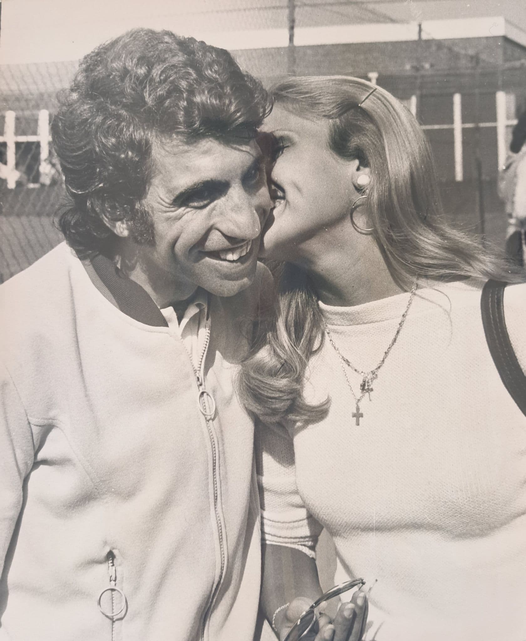 Black and white press photo showing Manual Orantes, with his wife, just after winning the 1975 British Hard Courts title at Bournemouth; portrait; press markings and information to rear; portrait; c.20cm by 25cm