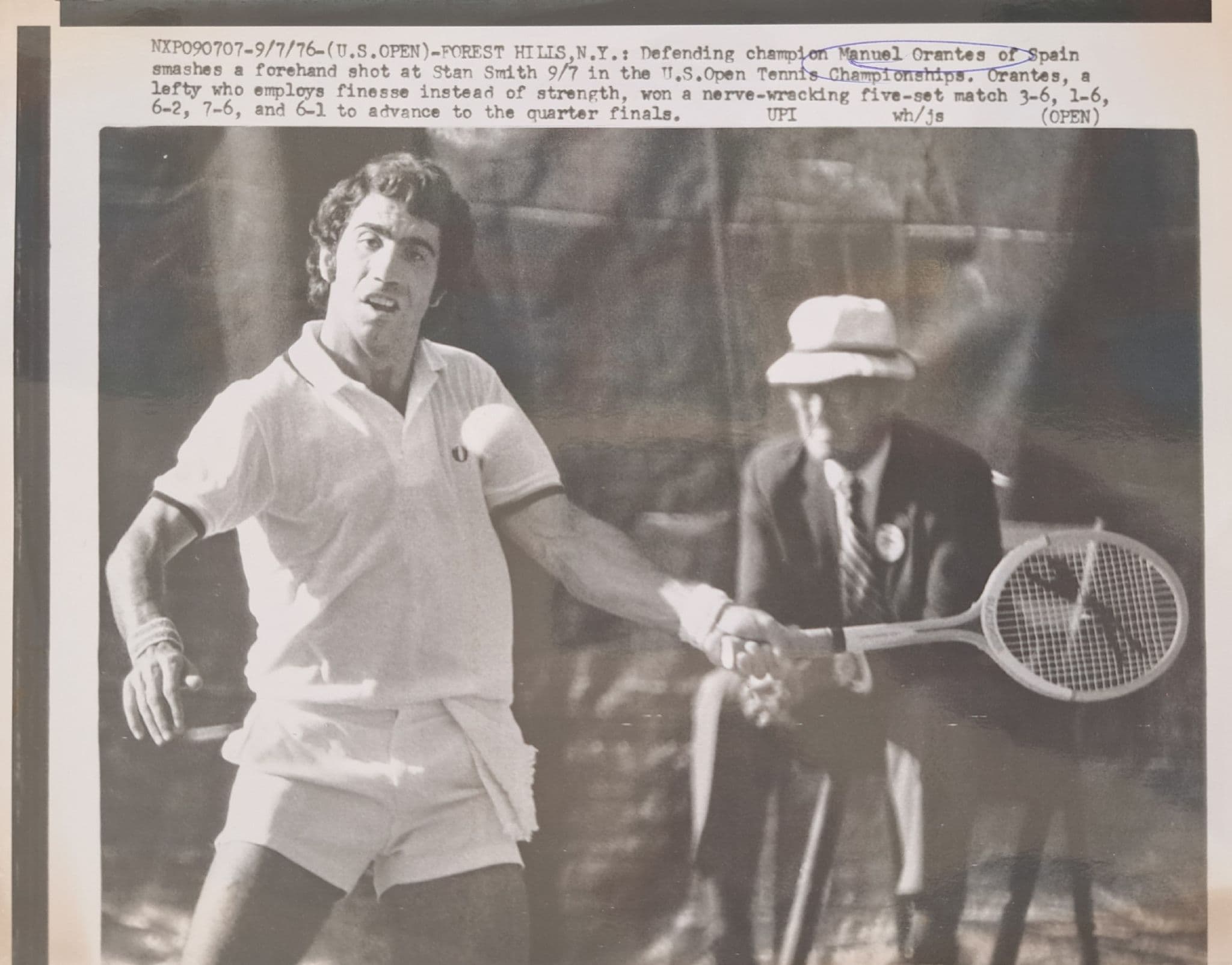 Black and white press photo showing Manual Orantes hitting a forehand during his 1975 US Open last 16 match against Stan Smith; landscape; press markings to rear and front; image is c.15cm by 20cm - with press information outside that