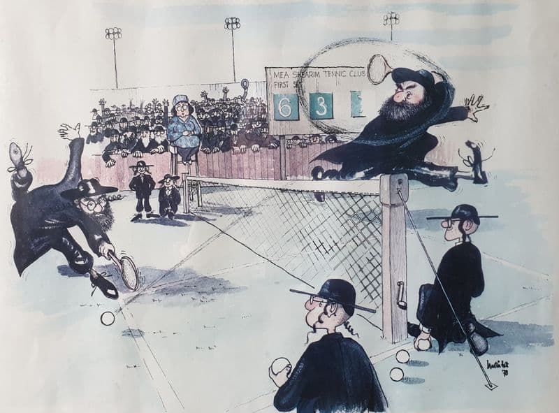 Limited edition tennis print by Martin Holt - 46 of 200; pencil signature to the border below the picture; image is approximately 52cm by 40cm; framed with glass cover, which means that it will be a little more expensive to post than other items (!); overall size is about 62cm x 52cm; the artist has produced a number of humorous Jewish cartoons across a variety of subjects