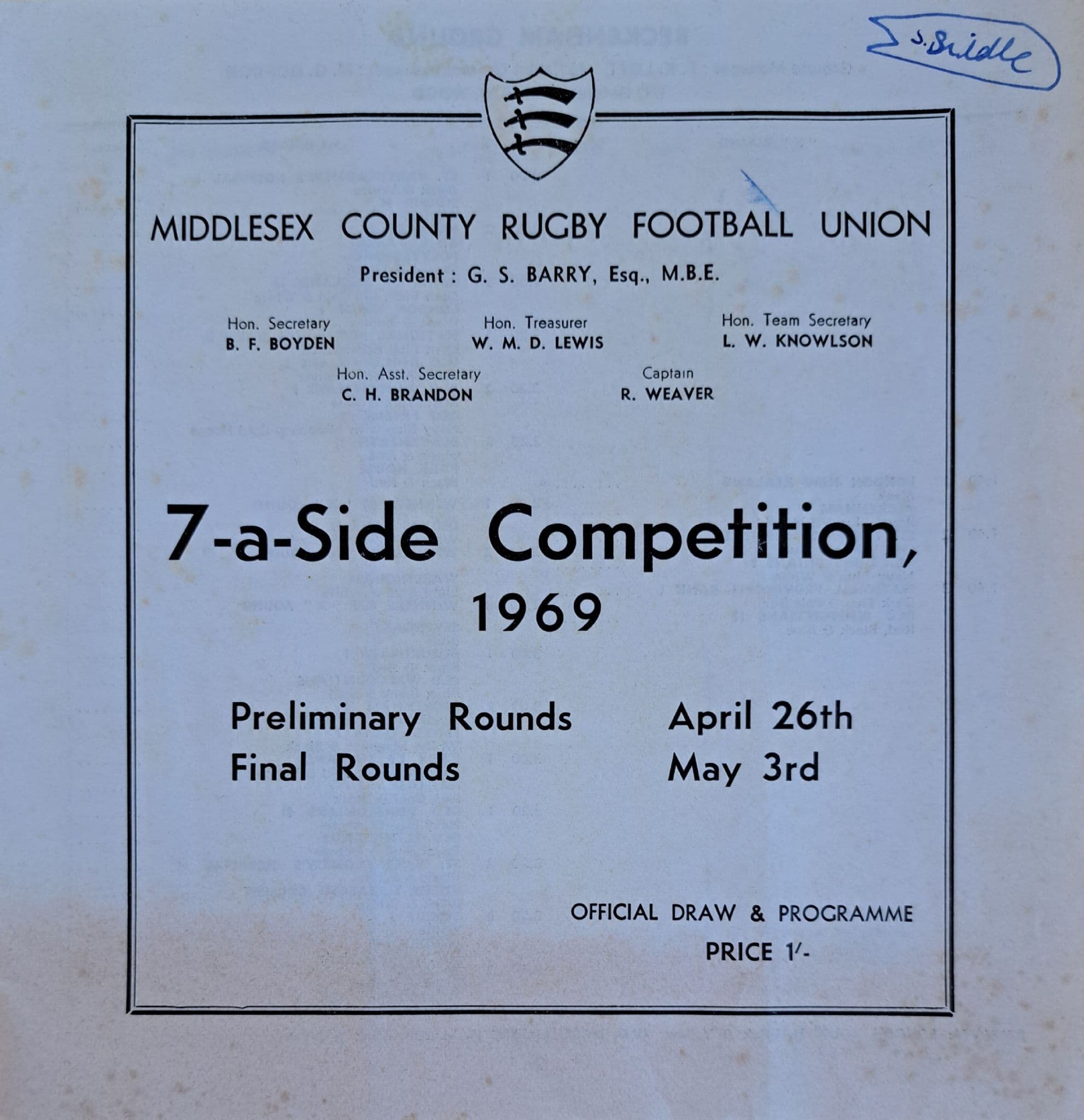 Programme from the Middlesex 7-a-side Preliminary Rounds,held at various grounds on April 26th, 1969; 20 pages; in fairly good condition, with very slights pocket fold, "S Biddle" on the front cover and results / finalists marked on some pages