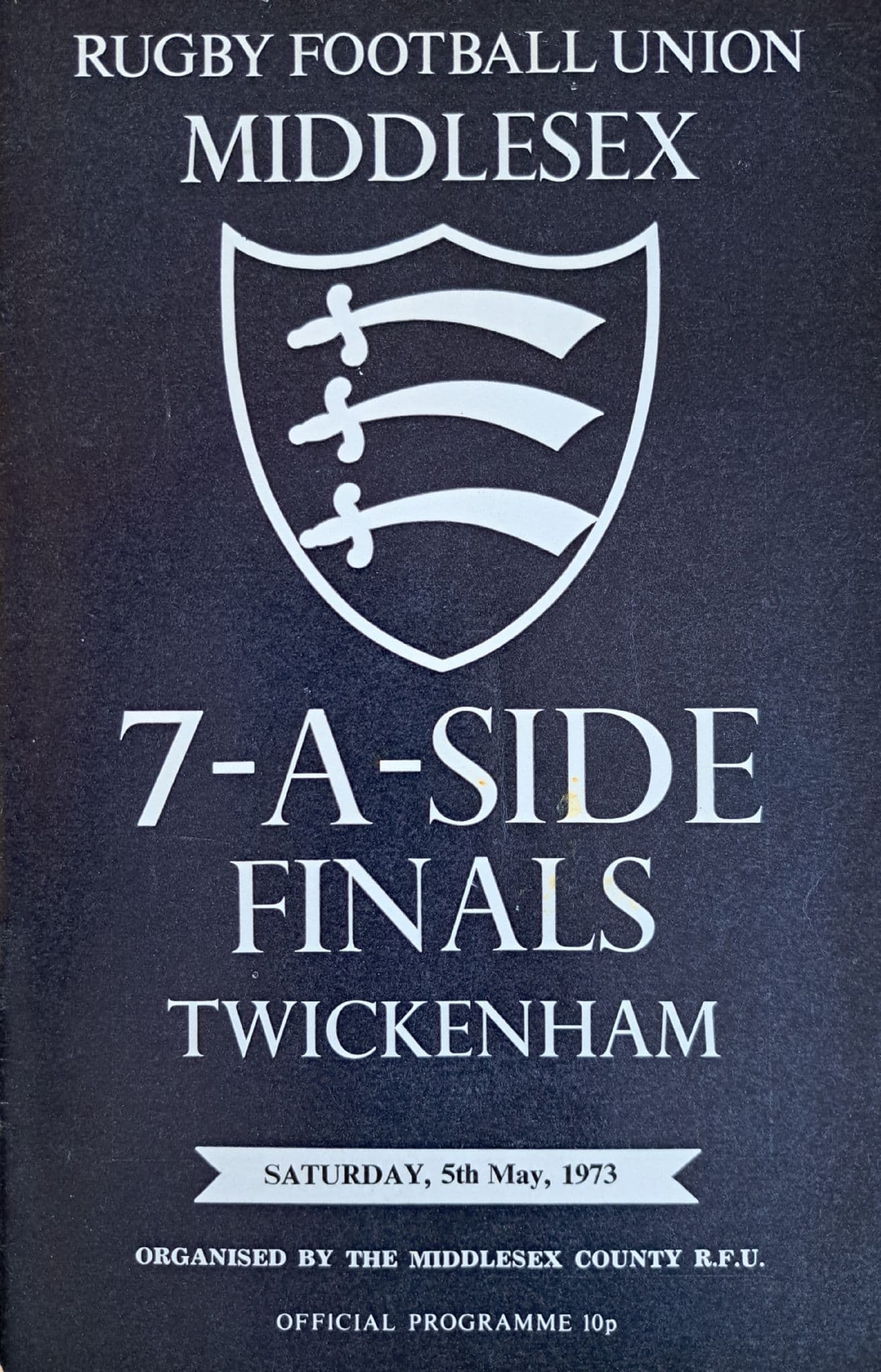 Programme from the Middlesex 7-a-side Finals,held at Twickenham on Saturday May 5th, 1973; 24 pages; in good condition, with a hint of a pocket fold and results marked neatly inside