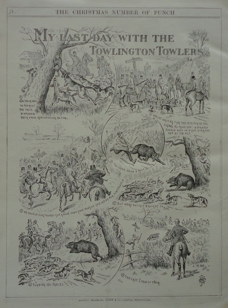 Hunting (with the Towlington Towlers) cartoon by an unknown artist - though the signature appears to be HJC or CJH or .....; full page cartoon from the Christmas edition of 1891. Would look excellent framed ..... The Racketeer knows as he already has a number of these in the study!