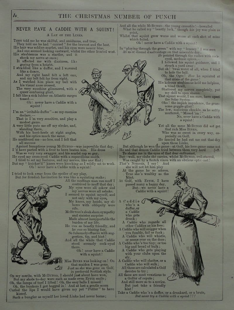 Golf cartoon by an unknown artist - as the signature is difficult to decipher; 3 black and white cartoons (plus poem) from the Christmas edition of 1891. Would look excellent framed ..... The Racketeer knows as he already has a number of these in the study!