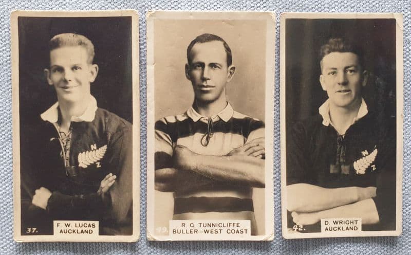 3 of 50 cigarette cards from the WD & HO Wills (overseas) series "New Zealand Footballers"; in fairly good condition; cards are 37, 42 and 49