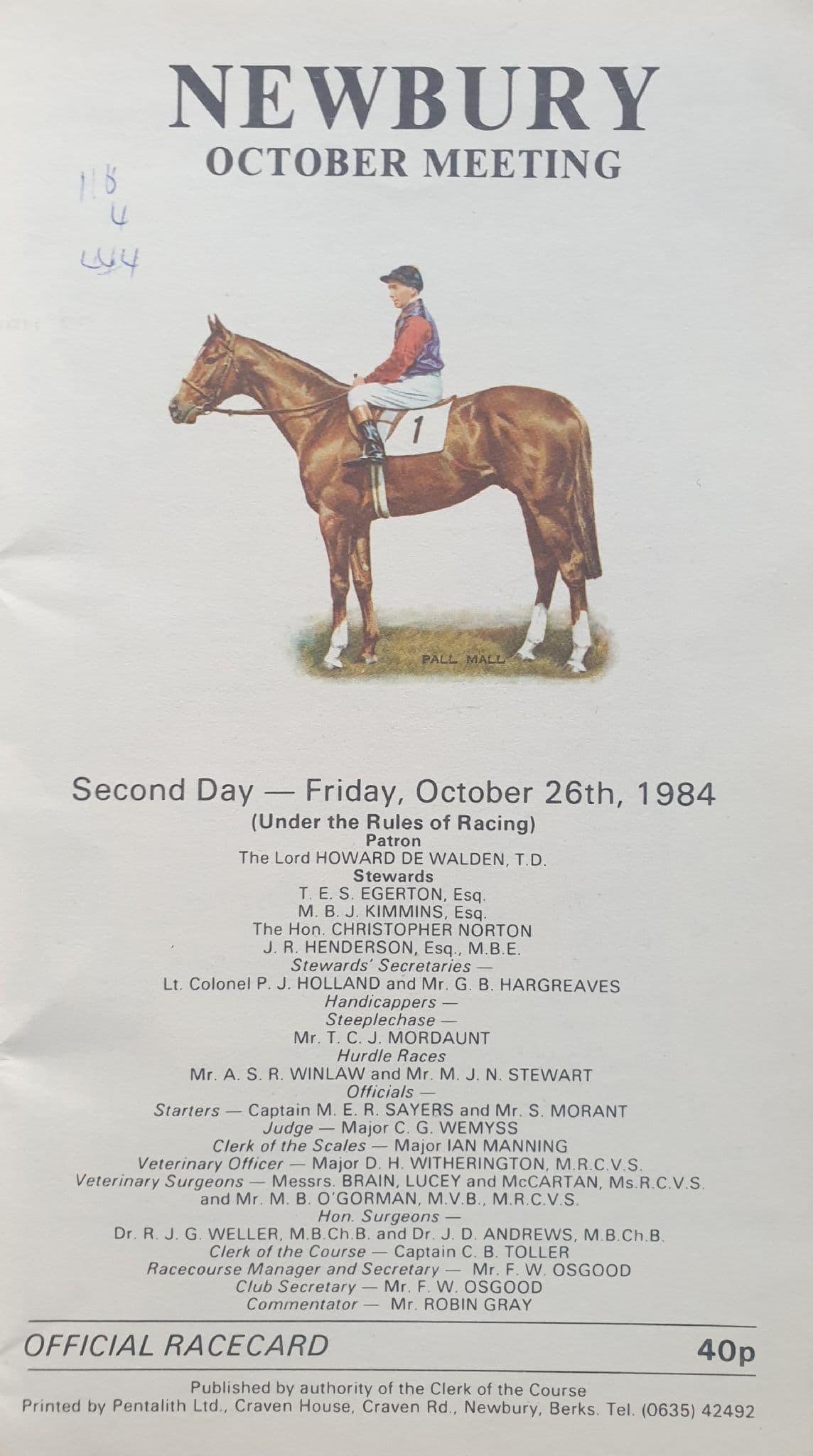 Programme for the second day of the Newbury October Meeting - held on Friday October 26th, 1984; 20 pages, plus advertising "wrapper"; small format; in good condition, but with some numbers added to the front cover