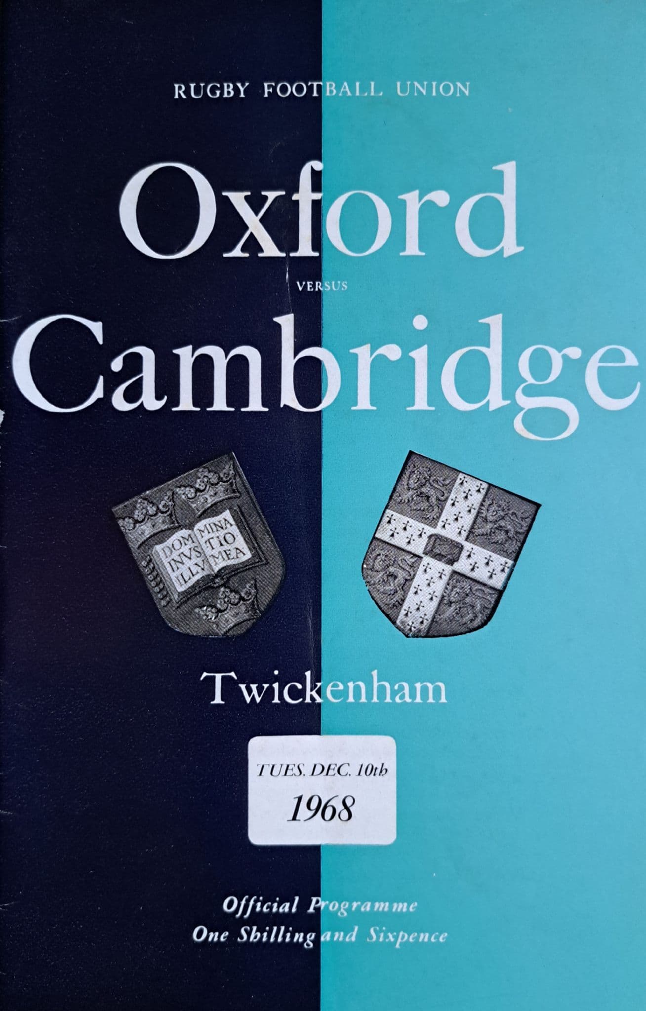 Programme from the 87th Varsity match between Cambridge and Oxford; played at Twickenham on Tuesday December 10th, 1968; 24 pages; in good condition, with very slight marking to the spine