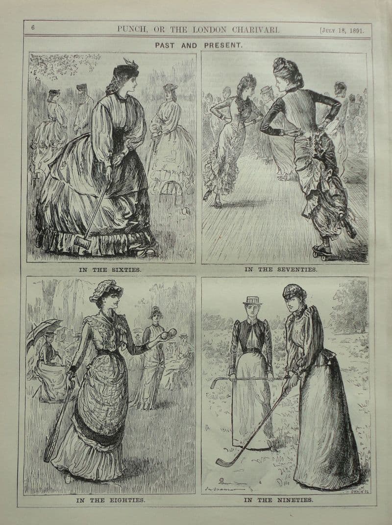 Four cartoons, showing ladies' sporting fashions from the 1860s to the 1890s - sports portrayed are croquet, roller-skating (!), tennis and golf .....; "Swain SC" suggests the work of Joseph Swain the prolific engraver - or one of his assistants; full page cartoon from the July 18 1891. Would look excellent framed ..... The Racketeer knows as he already has a number of these in the study!