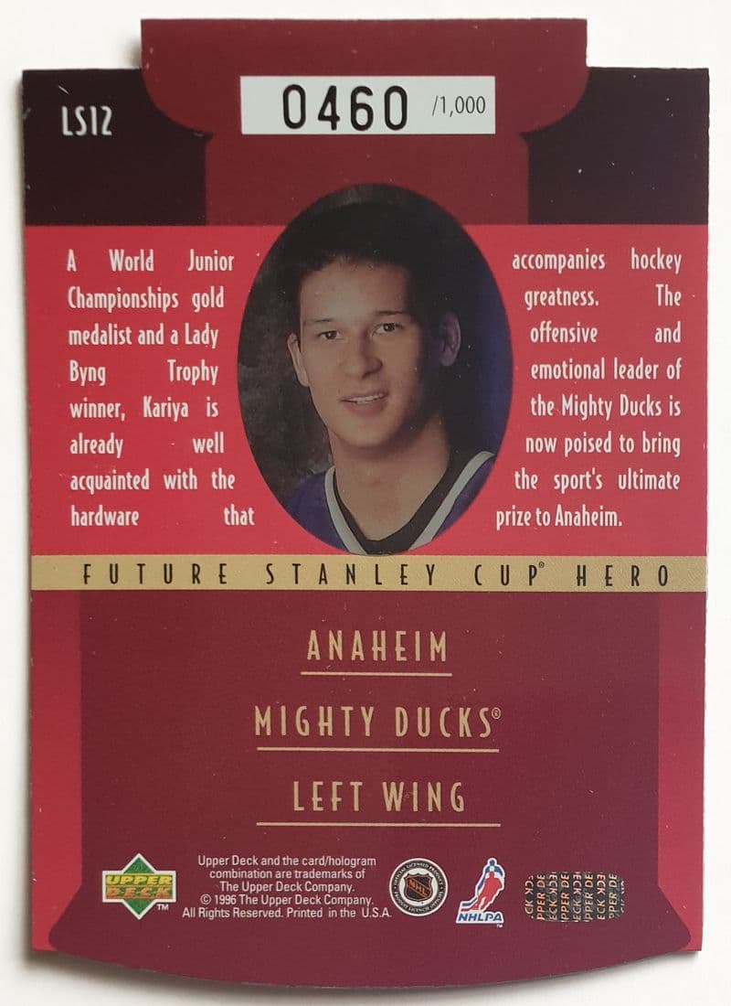 Limited edition NHL player card issued by Upper Deck in 1996; in very good condition; card is of the Anaheim Mighty Ducks Left Wing - Paul Kariya; limited edition - LS16 - 0460 of 1,000; mirrored / transparent on one side, and a "Future Stanley Cup Hero"