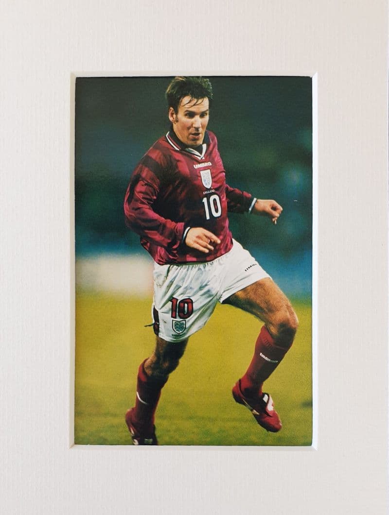England football postcard; 15cm by 10cm; portrait; writing to the rear says "c1998 All rights reserved"; comes with backing and mount ready for framing; this card shows Paul Merson bursting forward in the England away kit
