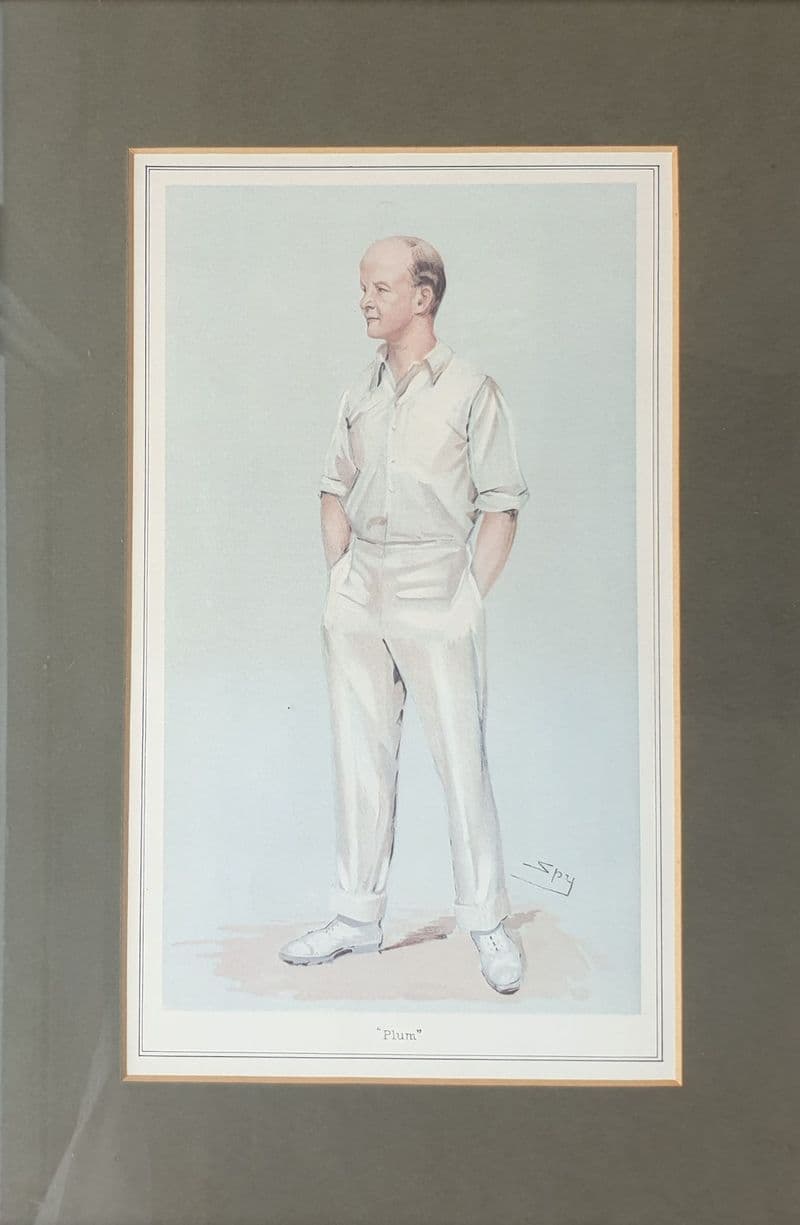 Coloured SPY print of Sir Pelham "Plum" Warner; 1903; image is approximately 27cm by 17cm, with green mount around that; a re-framing would probably set the picture off more favourably - and there is also a small chip to the bottom left-had corner of the frame; mini biography to the rear