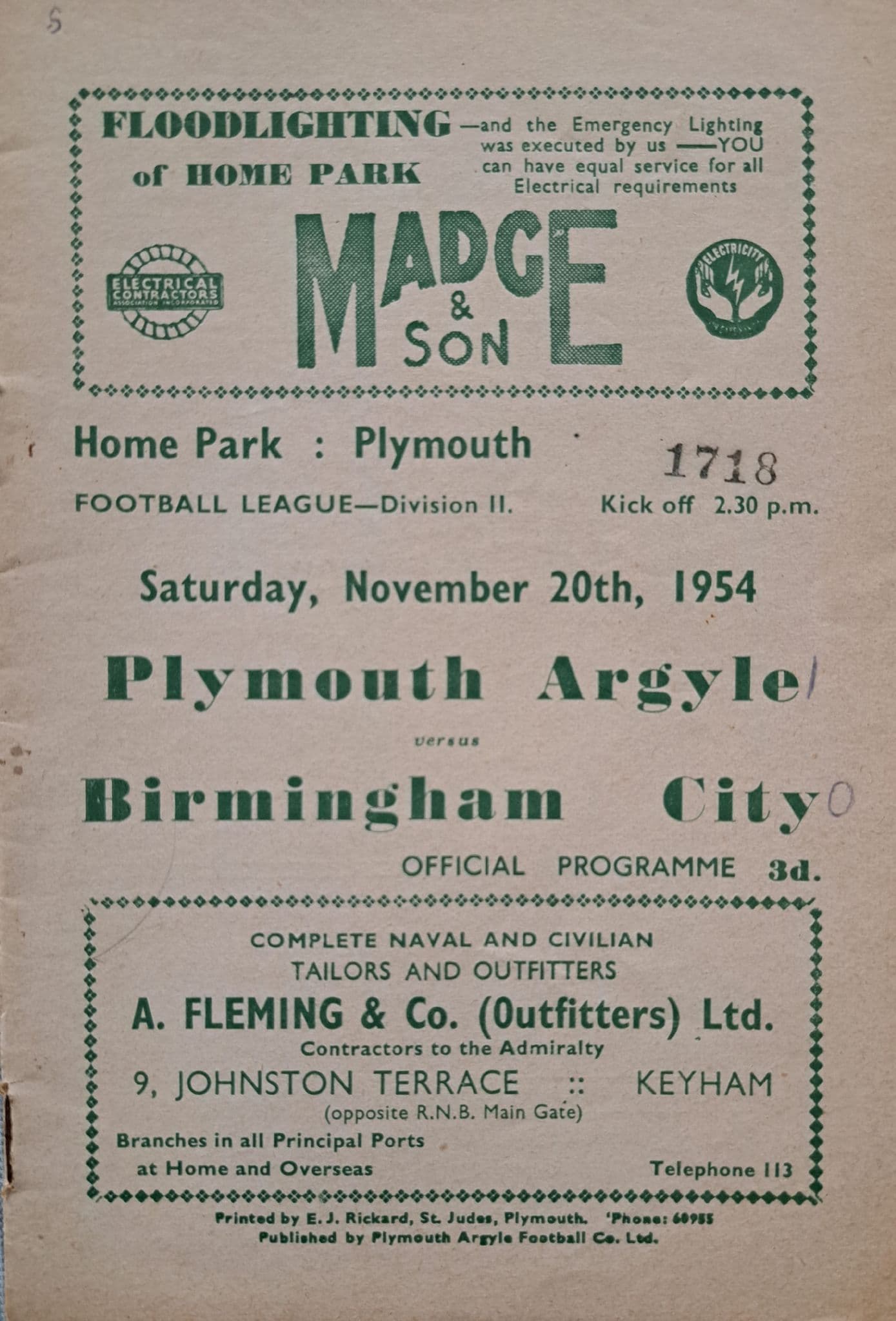 Programme from the Division 2 fixture between Plymouth Argyle and Birmingham City; played at Home Park on November 20th, 1954; 12 pages; in good condition, with score added to front cover / centre pages - and a small "S" on the top left-hand corner of the cover