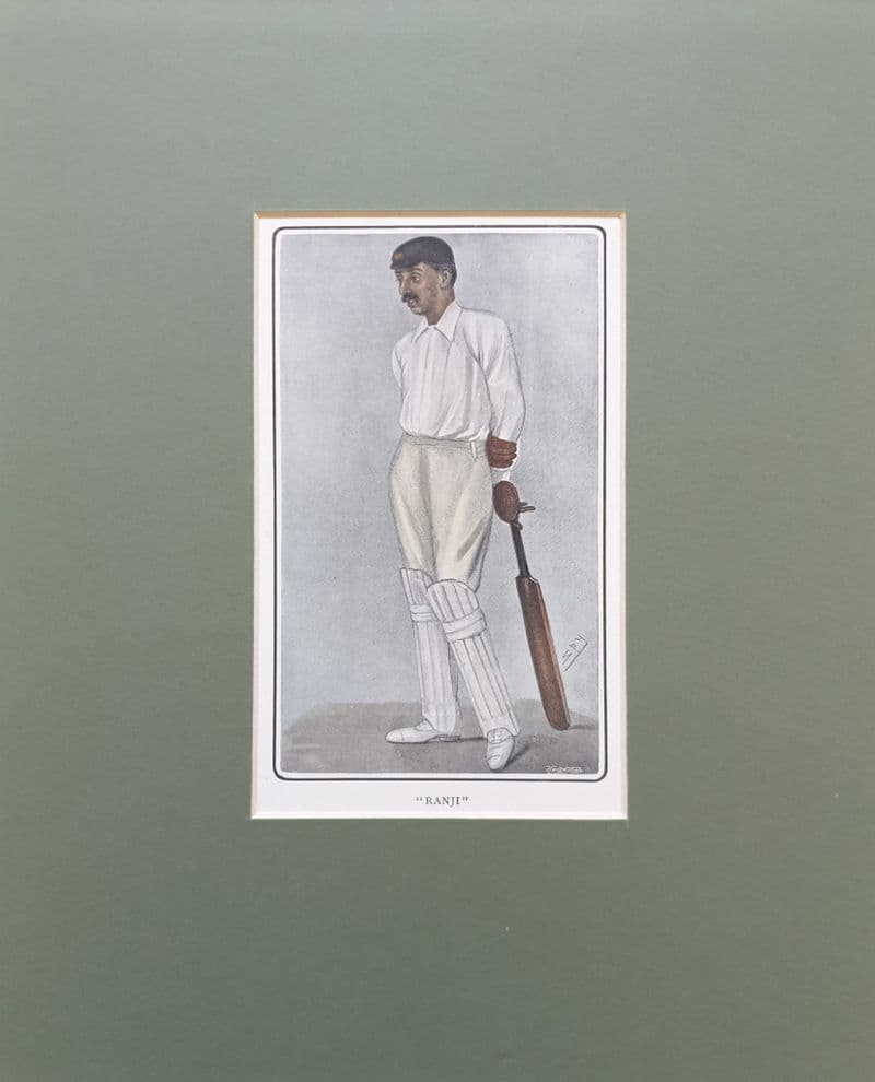 Hand-coloured SPY picture (possibly from a book or magazine), which shows KS Ranjitsinhji leaning casually on his bat; comes with green backing and mount ready for framing; border is about 23cm by 28cm, with the image 15.5cm by 9.5cm