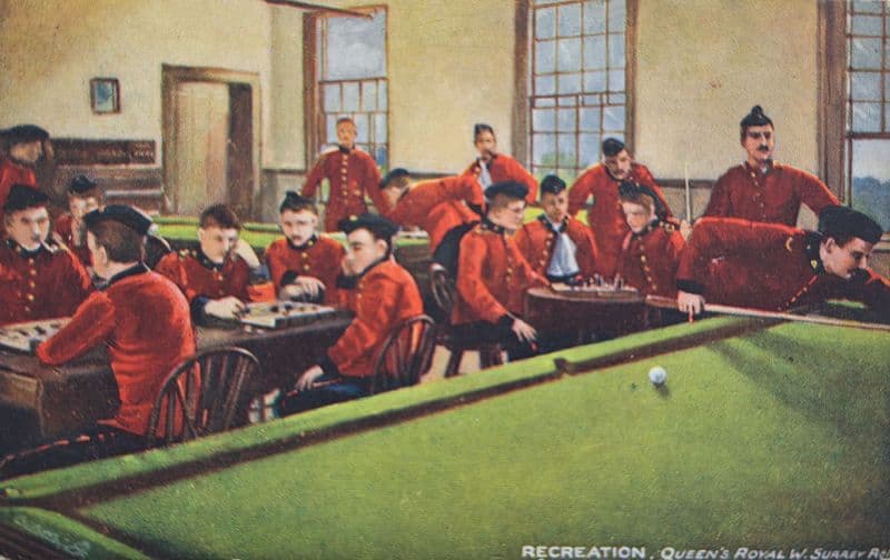 Colour postcard, showing the billiard table in the Queen's Royal West Surrey Regiment Recreation Room; c.14cm by 8.5cm; part of the Raphael Tuck & Co "Oilette" Series - "Military Life 9038"; 1905 postmark to the rear; in fairly good condition, with some wear to the corners