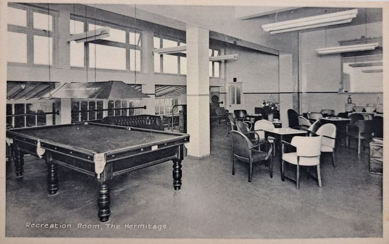 Black and white postcard, showing the billiard table in the Recreation Room at The Hermitage in Hastings - the building was used as a Canadian hospital in WWI, and as a convalescent home for many years after that; c.14cm by 9cm; published by The Grange Publishing Co