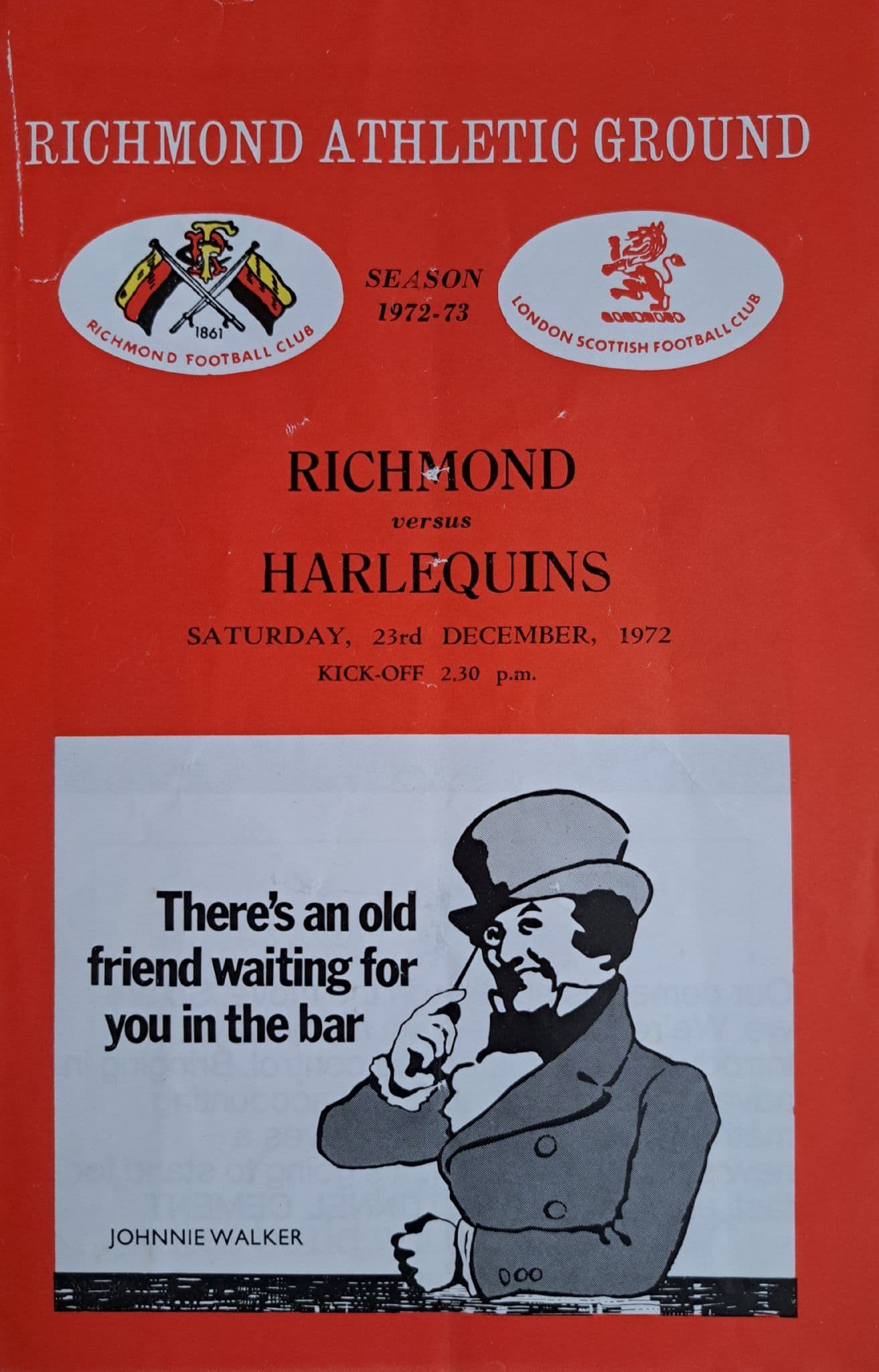 Programme from the game between Richmond and Harlequins - played on 23rd December, 1972; 8 pages. In fairly good condition with a vertical pocket fold but no writing