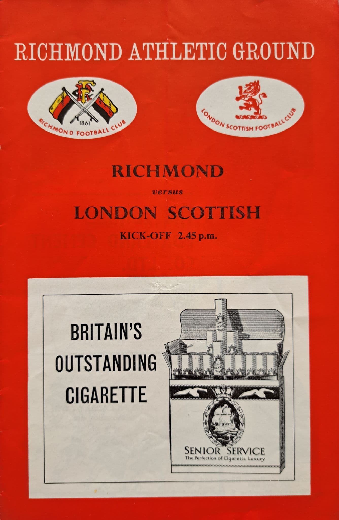 Programme from the game between Richmond and London Scottish - played on 16th November, 1963; 16 pages. In fairly good condition with slight signs of pocket wear and teams changes / scorers marked on the centre pages - which suggests a convincing win for the home side
