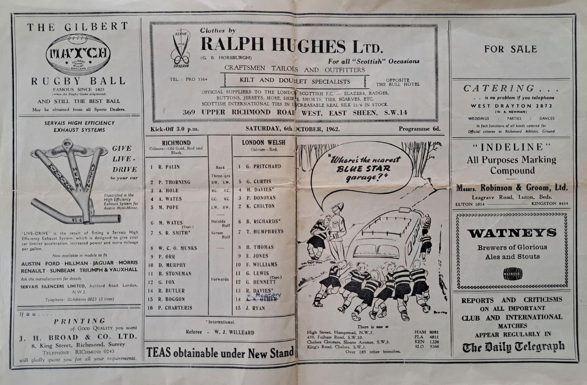 Programme from the game between Richmond and Rosslyn Park - played on 13th October, 1962; 8 pages. In fairly good condition with slight signs of pocket wear / folding and team changes marked on the centre pages