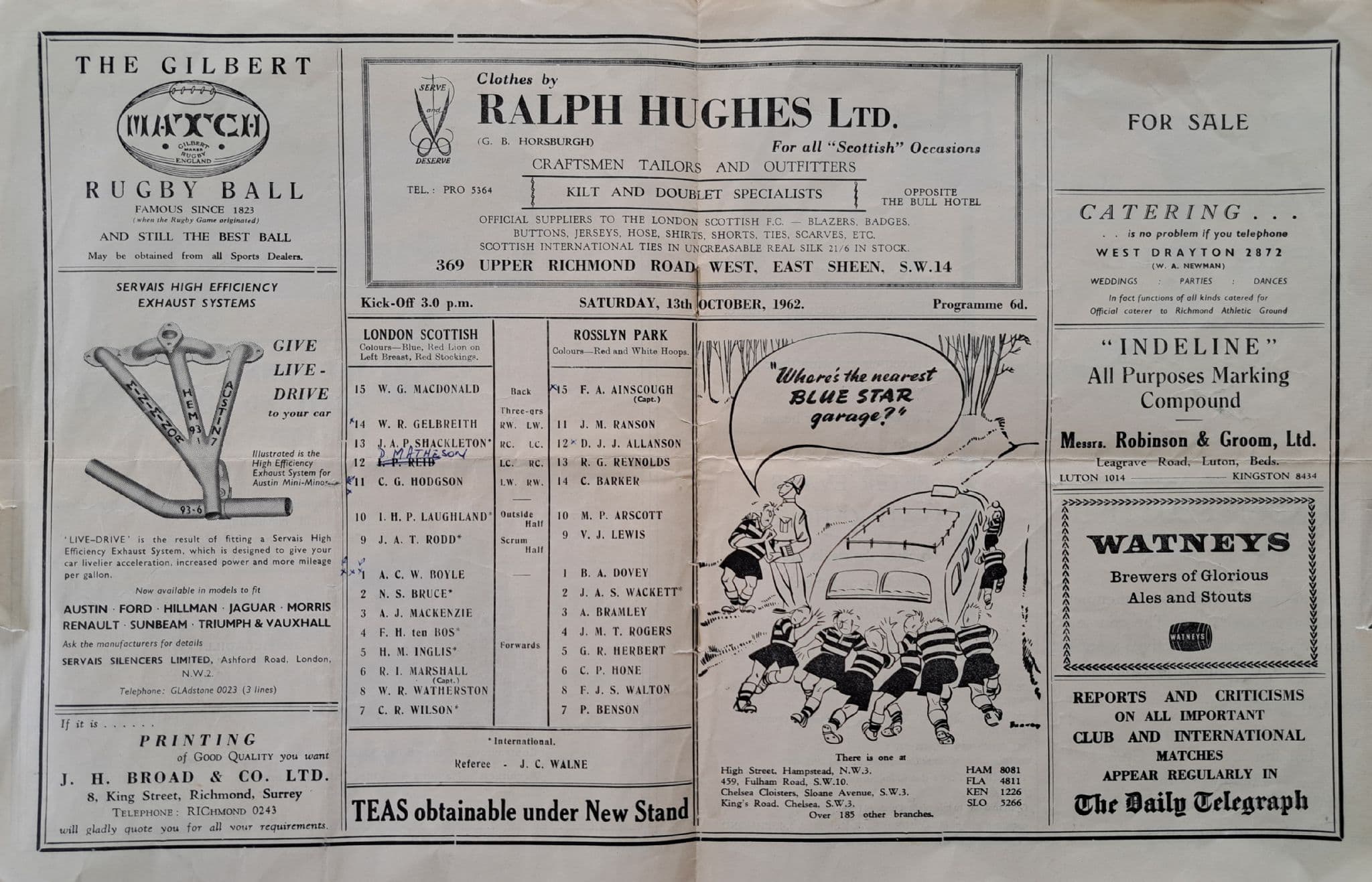 Programme from the game between Richmond and Rosslyn Park - played on 13th October, 1962; 8 pages. In fairly good condition with slight signs of pocket wear and teams changes marked on the centre pages