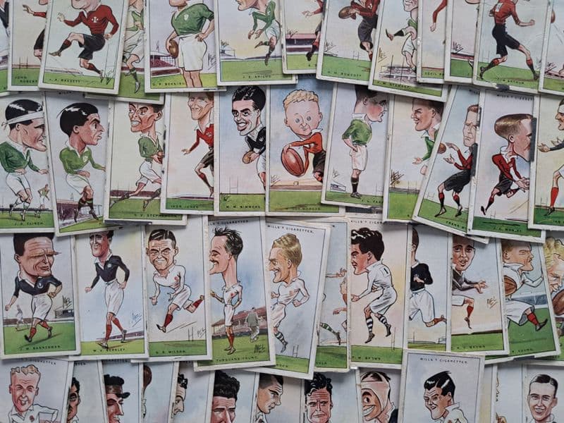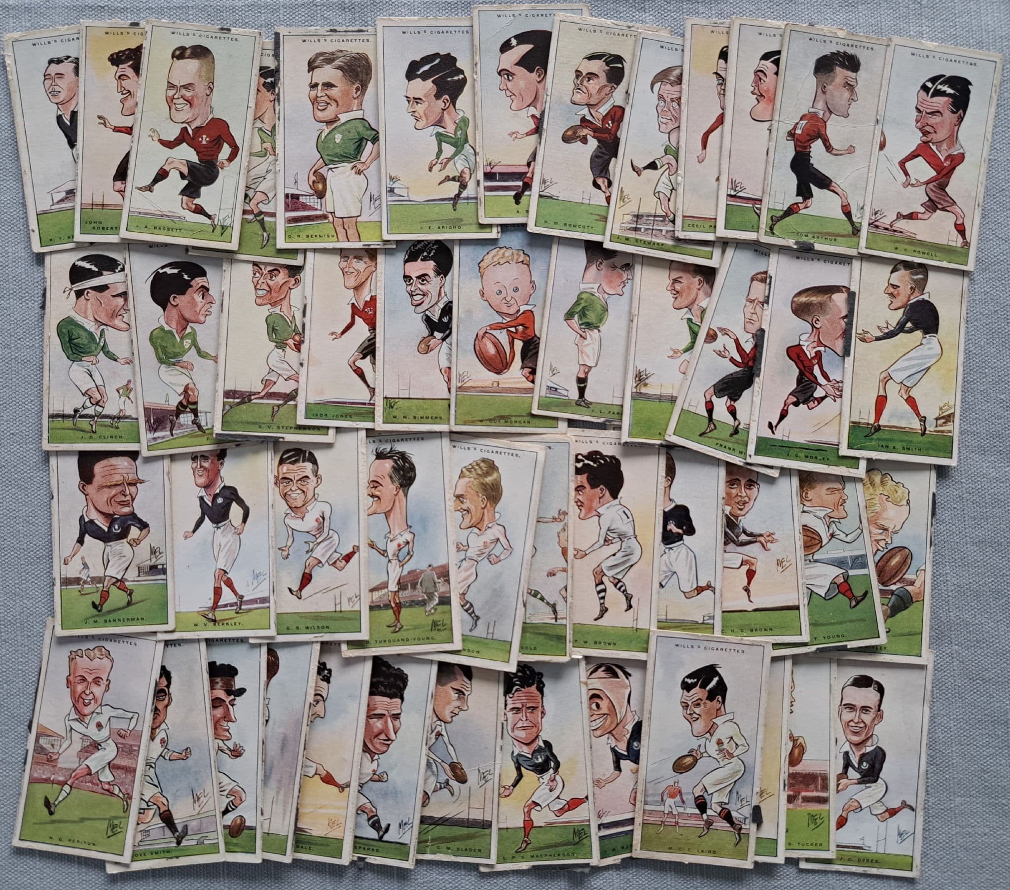 Full set of cigarette cards from the WD & HO Wills series "Rugby Internationals"; in fair to fairly good condition - with some signs of the backing paper / card, which they had previously been attached to (with some patience most of that can be removed!)